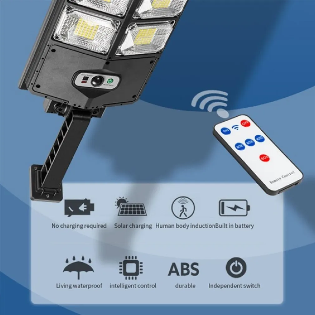 Induzione intelligente Solar Street Light, Risparmio energetico e protezione ambientale. Batteria da 3000 mAh integrata, il pannello solare funziona durante il giorno per riporre l’elettricità e può funzionare in modalità sensore movimento per 12 ore di notte. Corpo della lampada completamente sigillato, materiale isolante in plastica ABS, impermeabile e resistente. 3 diverse modalità di illuminazione, con un telecomando portatile per un facile controllo. Adatto per porte, cortili, corridoi, giardini e altri luoghi, facile da installare, nessun cablaggio richiesto. Brillante SMD2835 Chip a LED, ampia area di illuminazione, proiettore fino a 60 metri quadrati.