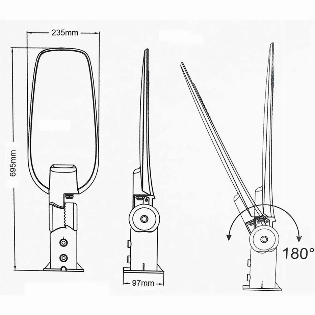 Regolabilità: Un’innovativa caratteristica di questa lampada è la sua capacità di inclinazione fino a 180 gradi. Questo consente un’installazione flessibile su una vasta gamma di pali esistenti, permettendo di adattarsi alle specifiche esigenze di illuminazione.