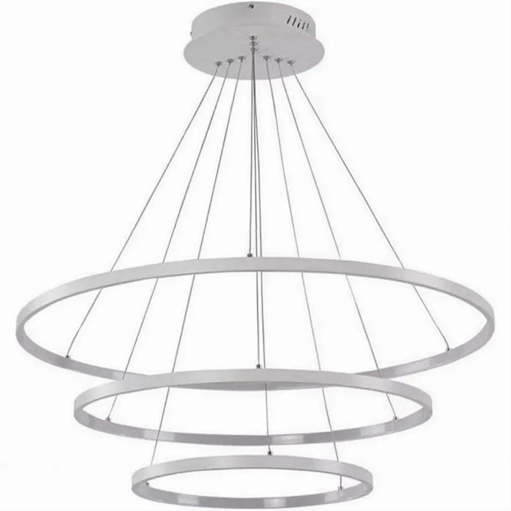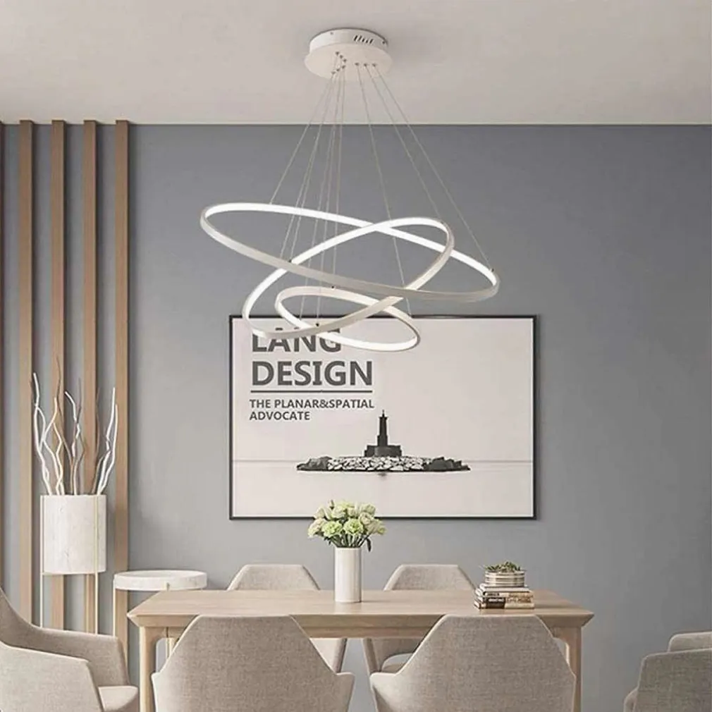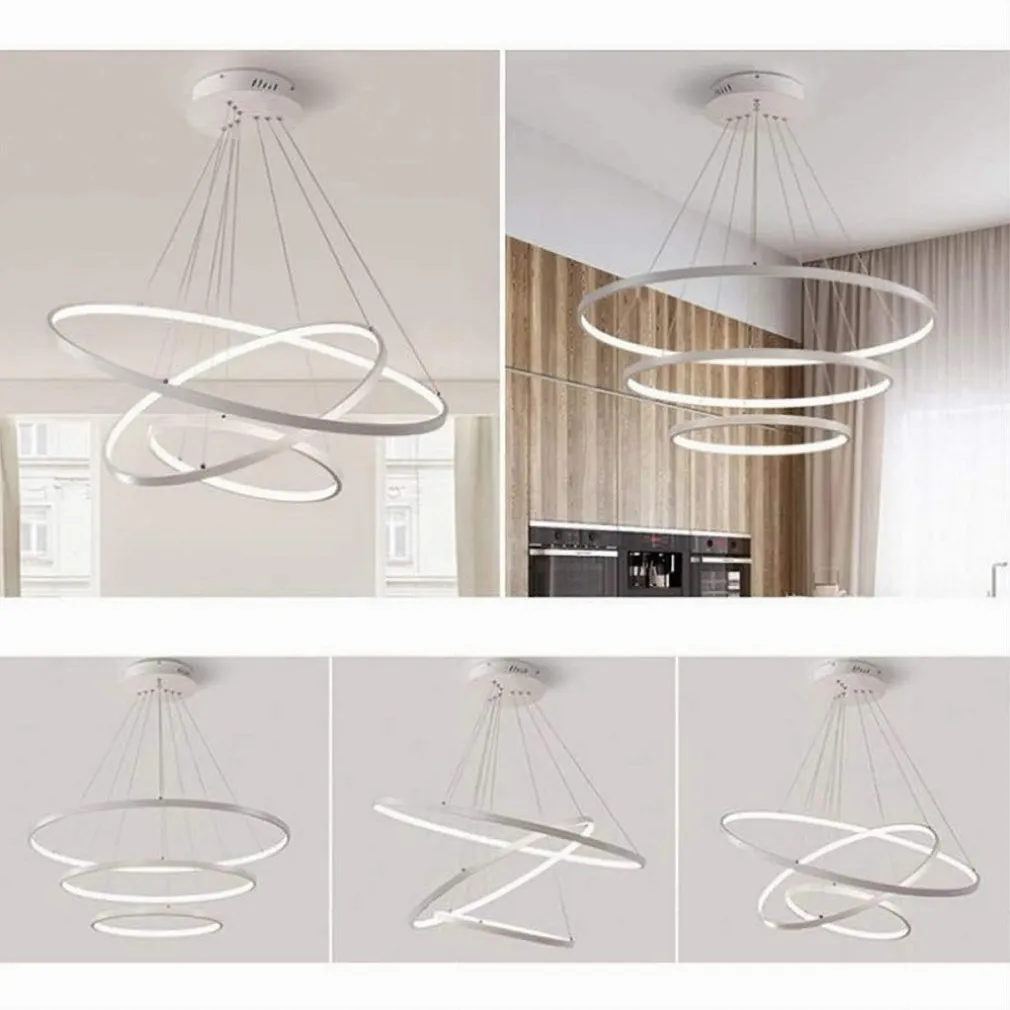 Realizzato con materiali di alta qualità come alluminio e PVC, il lampadario è progettato per durare nel tempo, garantendo una luce uniforme e accogliente. La sua struttura ad anelli sospesi crea un effetto visivo straordinario, trasformando ogni stanza in un luogo elegante e sofisticato.