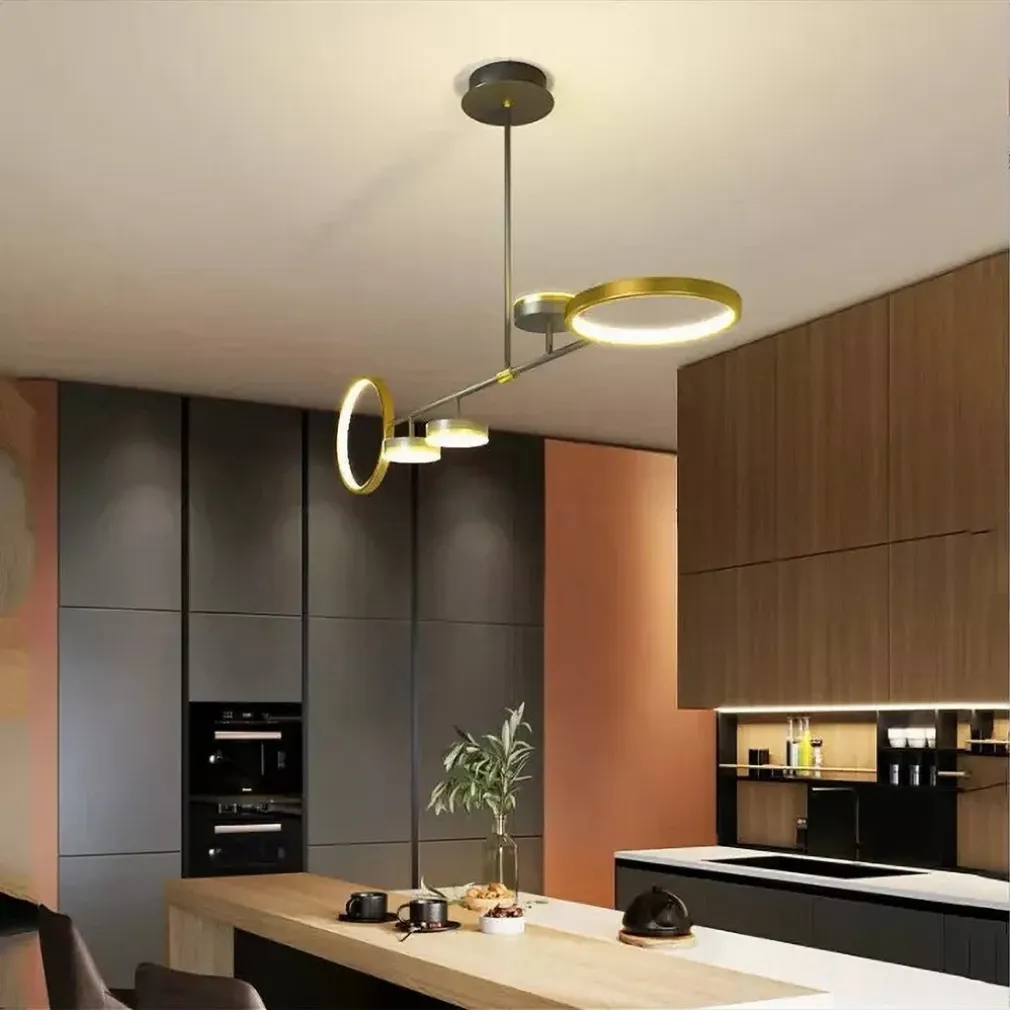 Questo lampadario si distingue per il suo design contemporaneo e la combinazione di materiali robusti e raffinati. La struttura nero e oro aggiunge un tocco di stile industriale, mentre la disposizione dei 5 cerchi garantisce una distribuzione uniforme della luce.