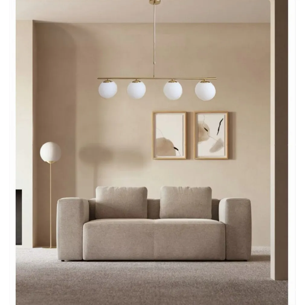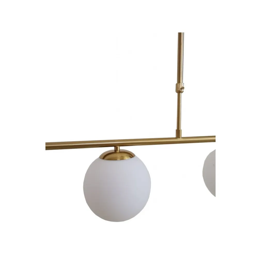 Il design elegante, le sfere in vetro bianco opaco e la struttura in alluminio oro satinato creano un contrasto perfetto tra modernità e raffinatezza. La possibilità di regolare l’altezza e il montaggio semplice lo rendono una scelta versatile e facile da adattare a qualsiasi spazio.