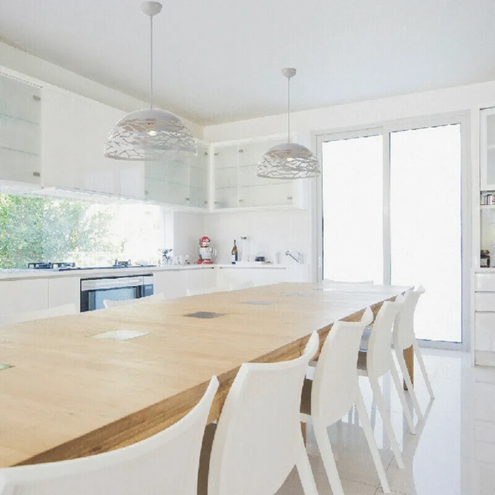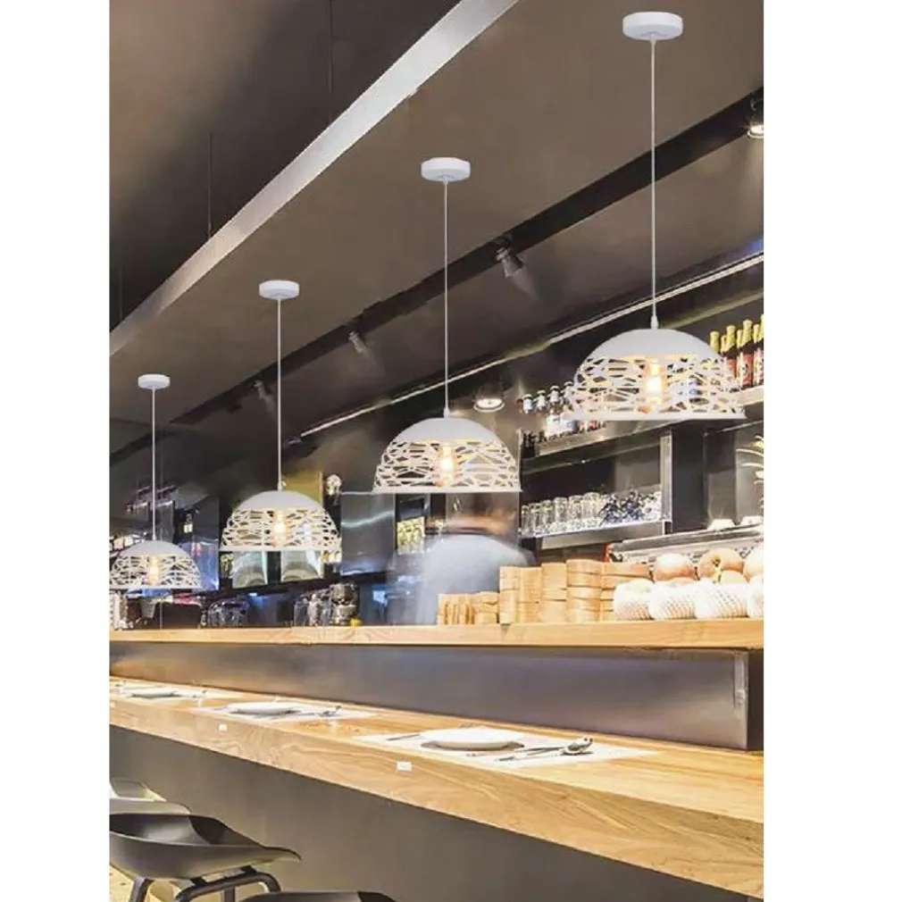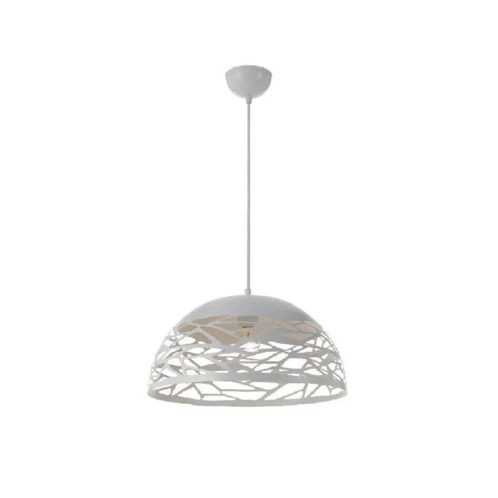 Lampada ultramoderna a sospensione composto da un paralume traforato in metallo per un emissione di luce a 360°, dall’impatto scenico unico e contemporaneo. Ideale per illuminazione di snack, angoli bar, banconi e cucine.