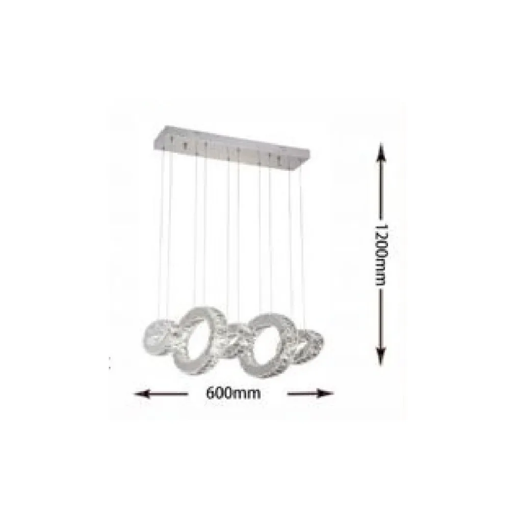 Lampadario moderno realizzato in acciaio e cristalli, con possibilità di poter scegliere la posizione dei 5 cerchi, uno sopra l’altro o come meglio preferite grazie alla possibilità di regolare la lunghezza. Con una potenza della luce di 42 watt e grazie ai cristalli e agli specchi si creerà un fantastico gioco di luci che abbelliranno maggiormente il lampadario. Adatto per soggiorno, camera da letto, hotel, ufficio, ecc.