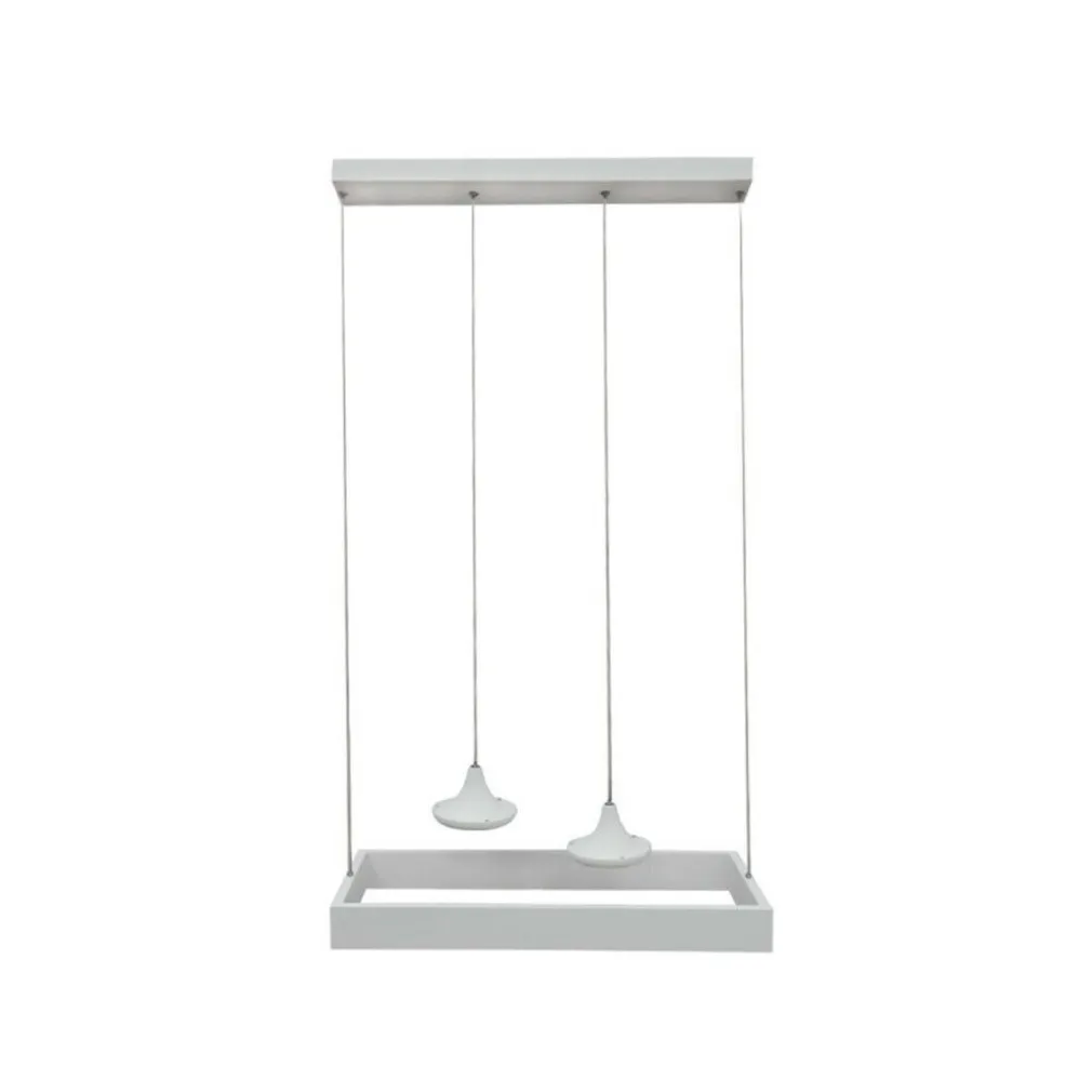 Lampadario da soffitto a led dal design minimale e moderno e dalla forma rettangolare, perfetto per conferire un tocco di originalità al tuo arredamento. Costituito da un rettangolo con bordo illuminato e due lampade centrali pendenti, con fili regolabili in base alle esigenze.