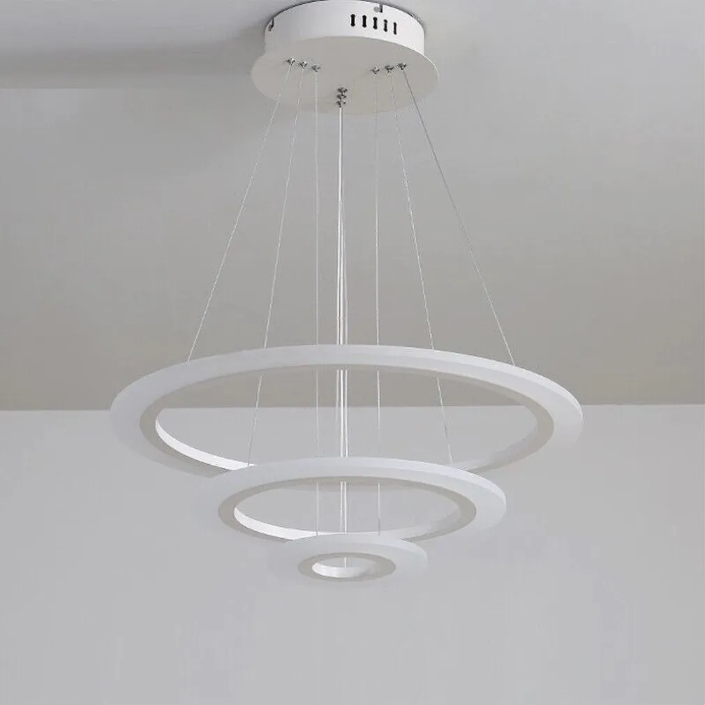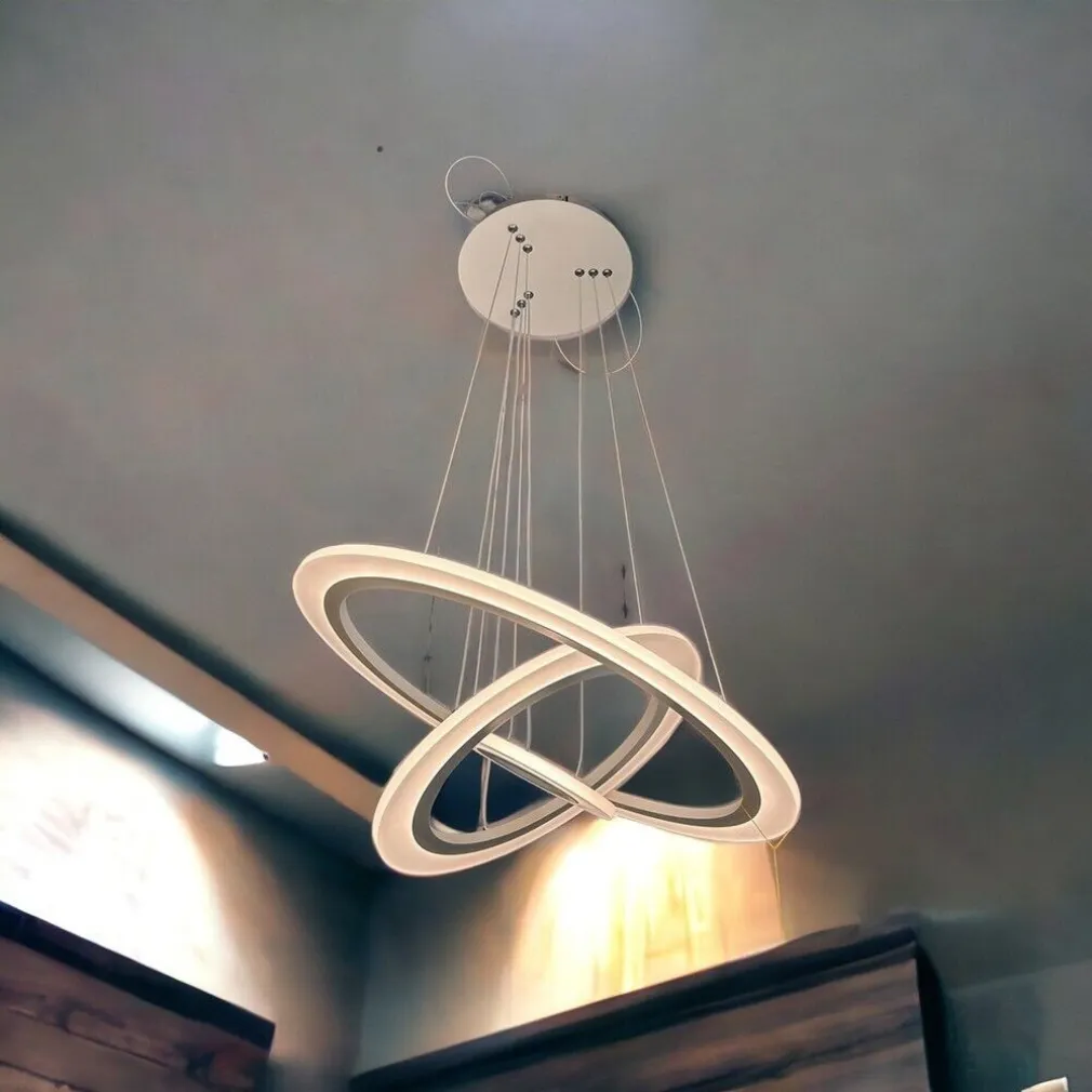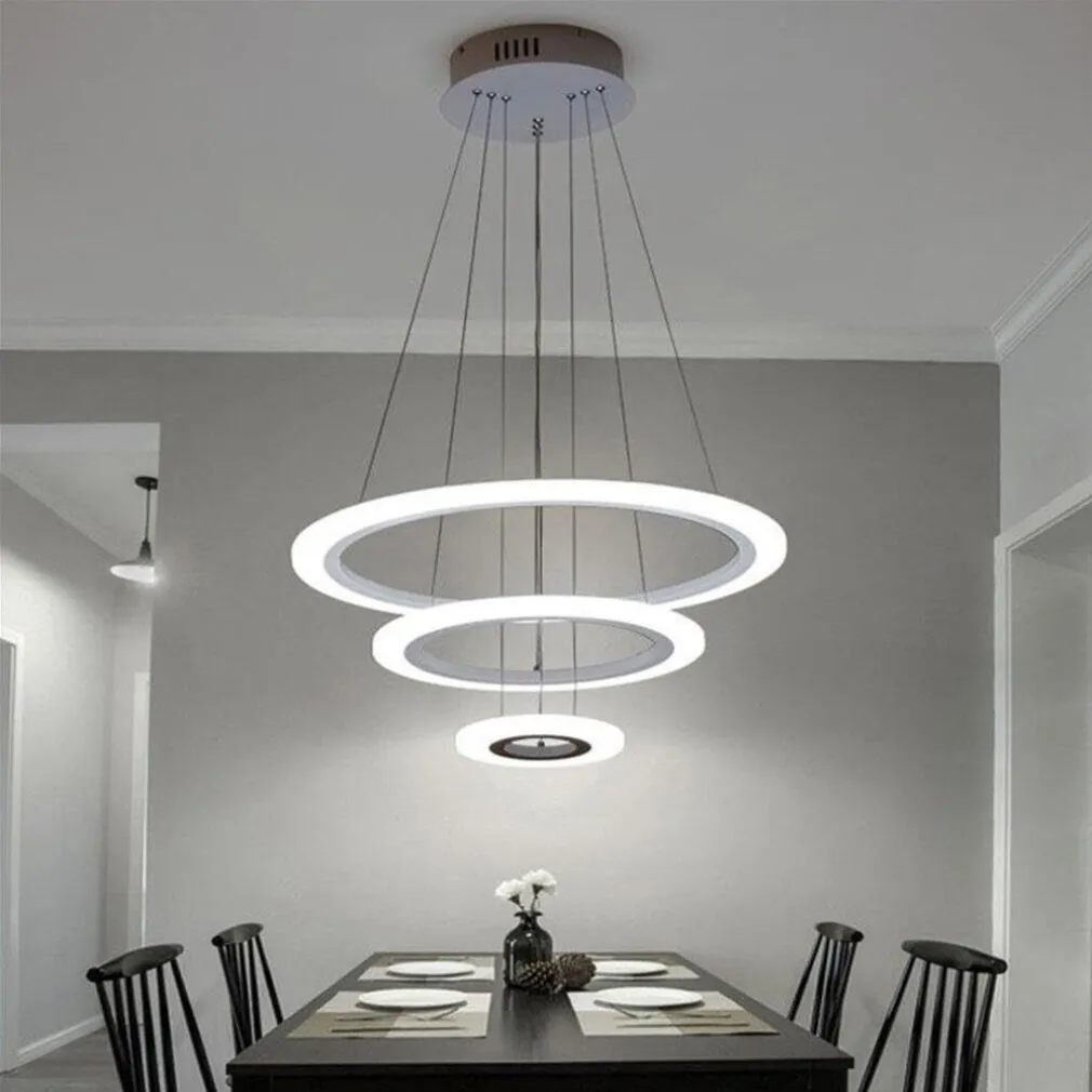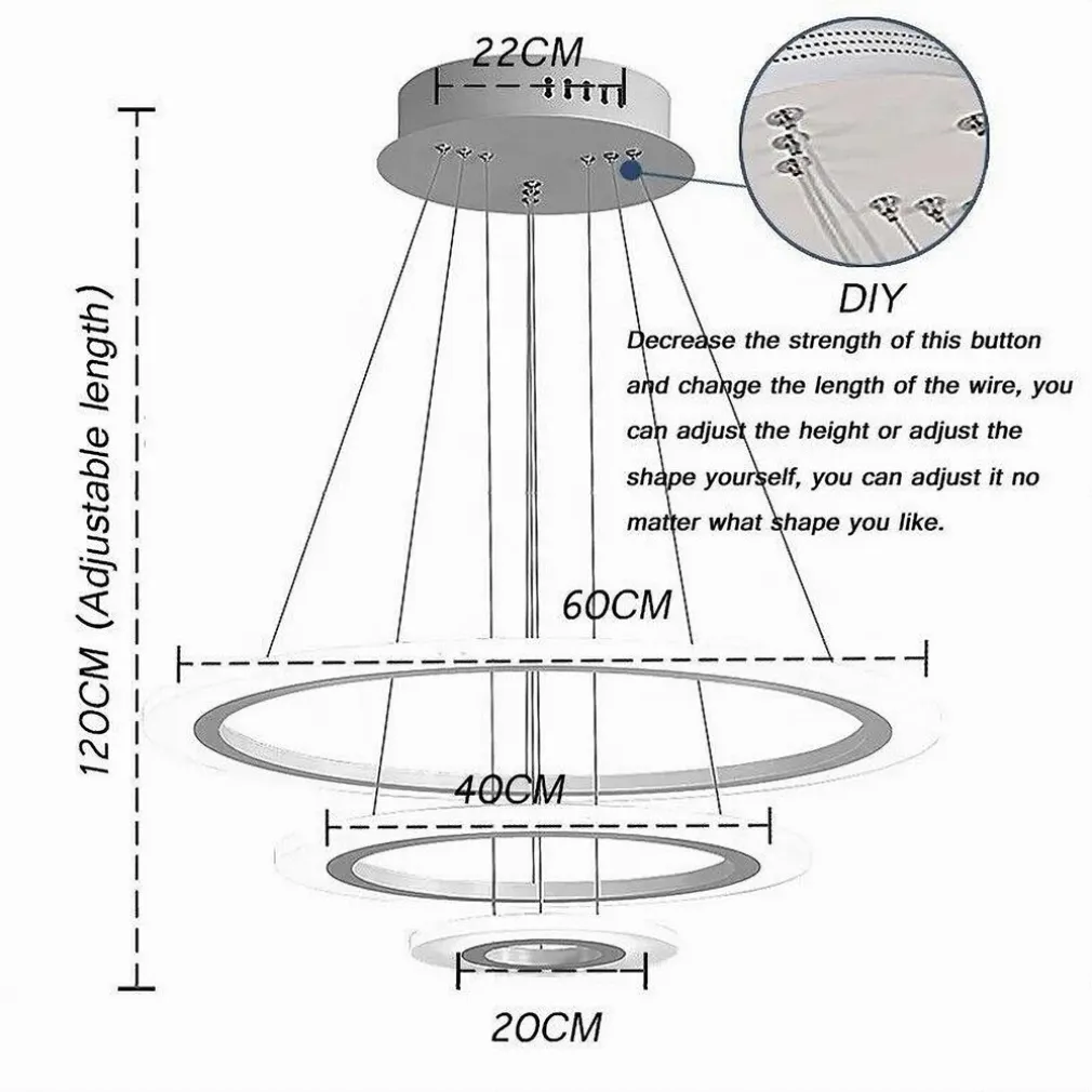 Questo lampadario è composto da tre anelli di diverse dimensioni piccolo, medio e grande, che possono essere regolati tra loro per creare la forma desiderata. Questa caratteristica unica consente di personalizzare il tuo ambiente e di adattare la luce alla tua preferenza.