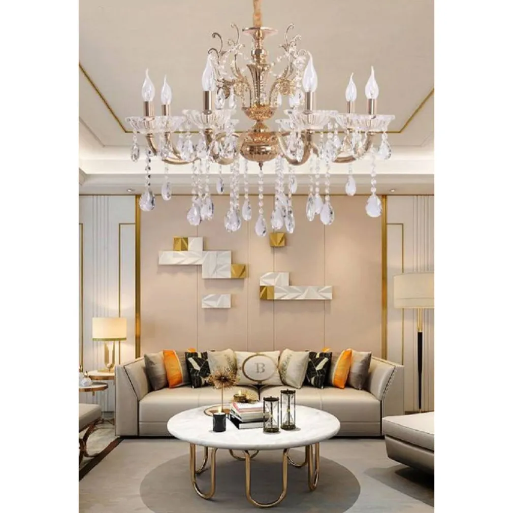 Lampadario da soffitto a 8 braccia impreziosito da gocce pendenti in acrilico che catturano e riflettono la luce offrendo un magnifico gioco di colori. Dotato di otto portalampada con attacco e14 (lampadine non incluse). Grazie al suo design regale, è perfetto per il vostro ingresso, sala da pranzo, soggiorno e altro ancora. Disponibile in due diverse colorazioni, oro o argento.