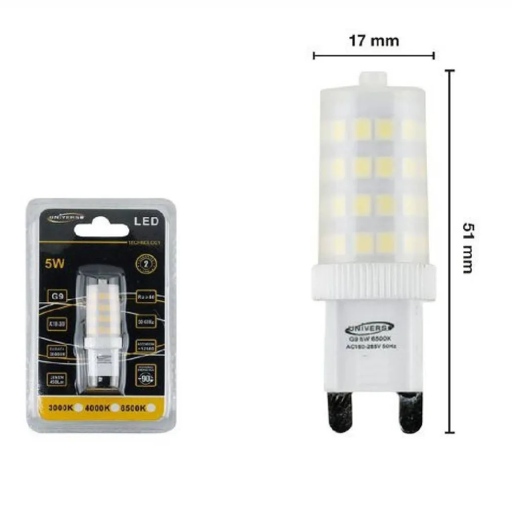 Lampadina con attacco G9 con 51 led smd ricoperti da una copertura in plastica semi-opaca. Disponibile a luce bianca fredda, calda e naturale con un fascio luminoso a 360 gradi. Facilissima da installare, la soluzione ideale per il cambio delle classiche lampadine senza alcuna modifica in lampadari, vetrine e armadi.