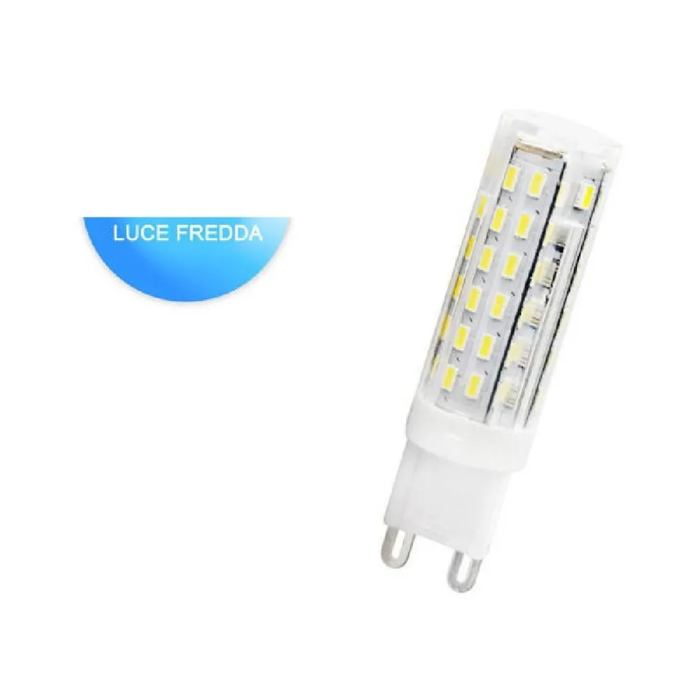 Lampadina con attacco G9 con 76 led smd 3014 ricoperti da una copertura in plastica trasparente. Disponibile a luce bianca fredda 6500K, calda 3000K e naturale 4000k con un fascio luminoso a 360 gradi. Facilissima da installare, la soluzione ideale per il cambio delle classiche lampadine senza alcuna modifica in lampadari, vetrine e armadi.