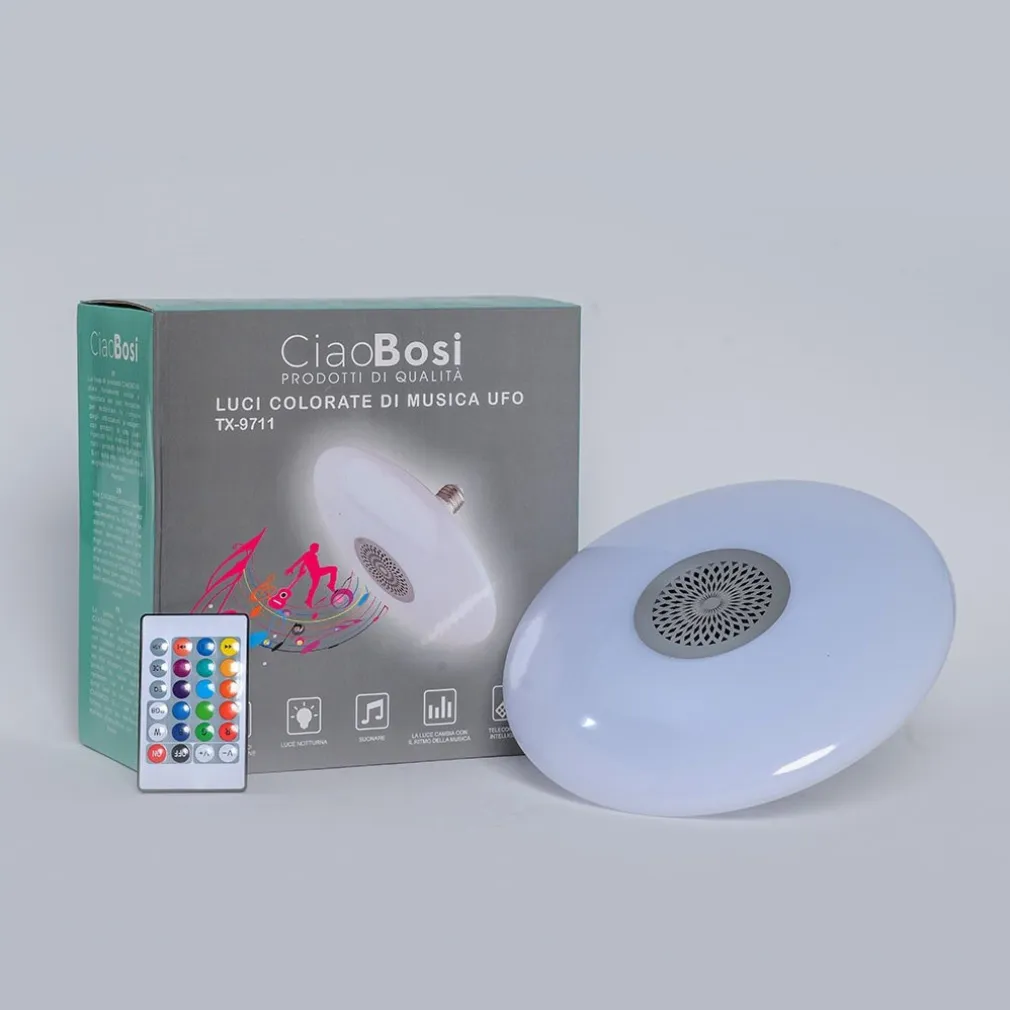 Luce musicale Bluetooth + telecomando. Un modello molto interessante, l’altoparlante-lampadina, ha l’aspetto di un disco volante. Ideale per tutte le stanze in cui soggiornate. Con l’aiuto del telecomando, puoi regolare la luce e il volume. Connessione Bluetooth, facile da installare e utilizzare.Facile connessione bluetooth con il tuo telefono smartphone.