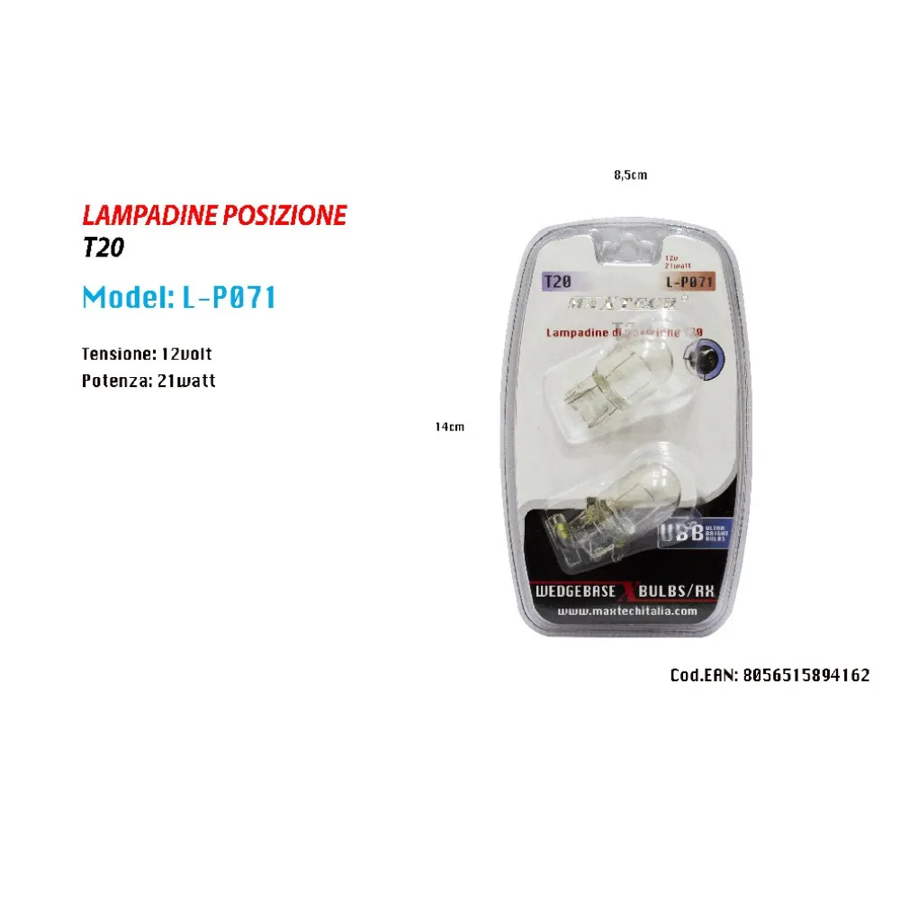 Benvenuto nella sezione dedicata alle lampadine di posizione T20 L-P071 da 12 volt e 21 watt, un prodotto che unisce prestazioni eccellenti e affidabilità per garantire la massima visibilità e sicurezza durante la guida.