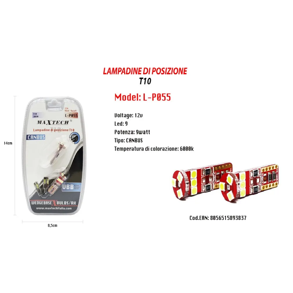LAMPADINE DI POSIZIONE CANBUS L-P055 12V 9LED 9W 6000K ULTRA LUMINOSE