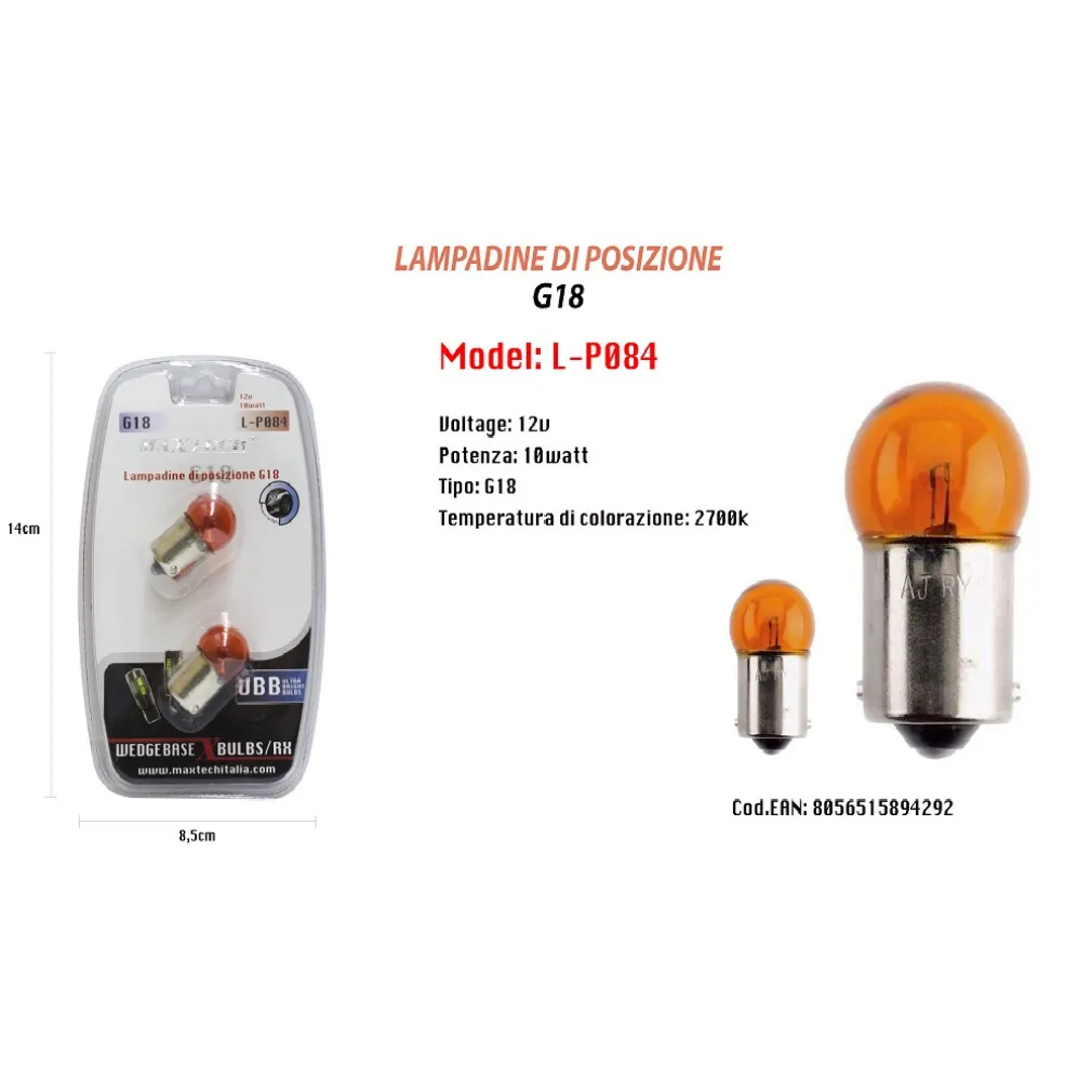 - Durata estesa: Realizzate con materiali di alta qualità, le lampadine di posizione G18 12V – 10 watt L-P084 sono progettate per durare nel tempo, offrendoti prestazioni affidabili a lungo termine.