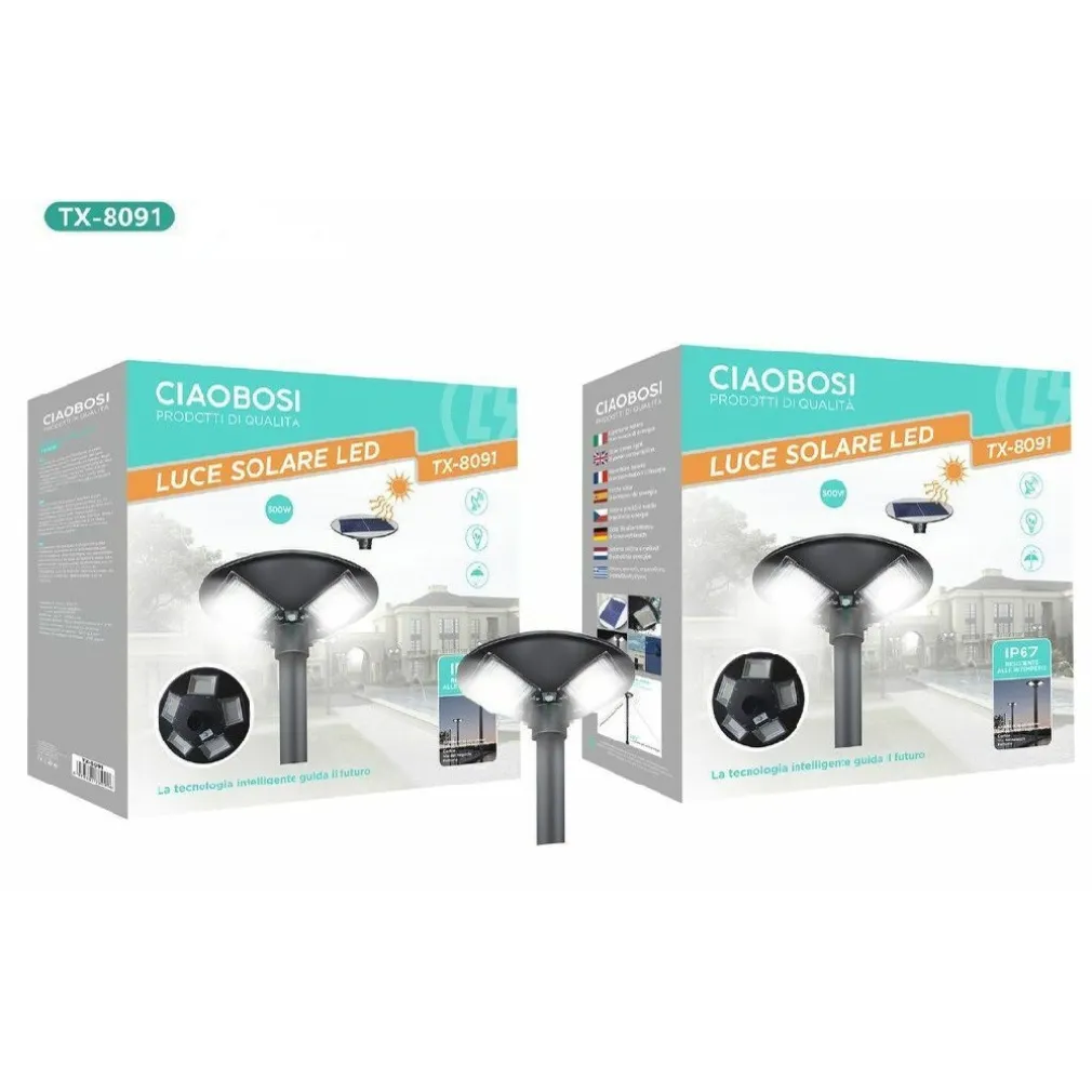 Lampada per l’illuminazione stradale LED ad energia solare con potenza equivalente di 500W. Realizzato in ABS di colore nero, con copertura dei LED in plastica trasparente. LED SMD 5730 (240pz x 0.2W) con fascio luminoso di 120° e flusso luminoso di 1000 lm. Questo lampione ad alta luminosità ha un elevato rapporto. Dotato di grado di protezione IP67, è adatto all’uso esterno anche sotto la pioggia prolungata. É equipaggiato con una batteria ricaricabile mod. 32650 (3.2V da 10Ah) ed un pannello solare che garantiscono un’autonomia di circa 12 ore. La ricarica avviene in circa 6-8 ore. Nella parte superiore troviamo un pannello solare in Silicio Policristallino che rende autonoma dall’energia elettrica questa lampada. Inoltre, sfruttando anche tutto il potenziale dell’illuminazione LED, partecipano ad ottenere un considerevole risparmio di energia. Grazie al telecomando incluso (2 pile AAA incluse) è possibile accendere e spegnere il faro, regolare l’intensità luminosa (100% /50%), settare diversi timer di spegnimento e attivare la funzione auto che tramite lo smart sensor (sensore crepuscolare) farà accendere il faro al calare della luce. Il lampione si accende automaticamente al calare della sera ed è possibile attivare un timer di spegnimento dopo 2h/3h/4h dall’atto dell’accensione. Grazie al sensore di movimento (distanza di rilevamento 6-8 metri) integrato vi è la possibilità di ottimizzare il consumo di energia