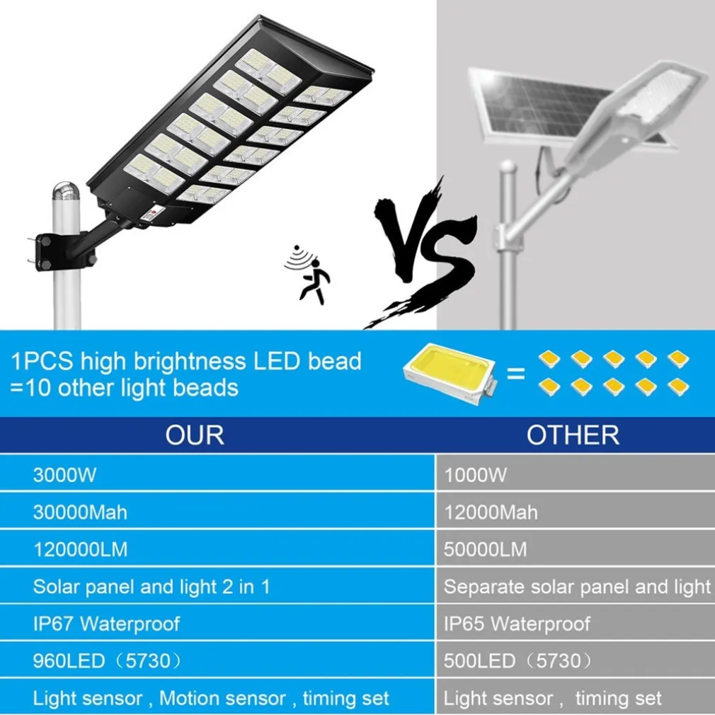 Alta luminosità a costo zero: fino a 99000000 lumen, garantiti da LED 5730 ad alta efficienza. Pannello solare policristallino A-grade con un +20% di rendimento.