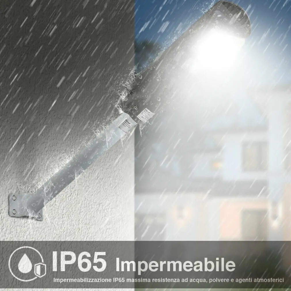 Illumina gli ambienti esterni di casa tua o della tua attività commerciale con il nuovissimo lampione stradale a LED ad altissima luminosità con pannello solare. La superficie di illuminazione di questo incredibile lampione, vanta di ben 1200 lumen di pura potenza illuminante garantiti da un chip a 192 LED che produce una luce bianco freddo ( 8000K ) ad altissima luminosità con un consumo di soli 120W, inoltre il faro è dimmerabile e la sua luminosità può essere regolata tramite il pratico telecomando, inoltre la particolare angolazione del fascio di luce garantisce un ampissima superficie di illuminazione. Il lampione stradale da esterno è fornito di pratico sensore di movimento, che passa automaticamente il livello di illuminazione del faretto da risparmio energetico (600 lumen) ad illuminazione massima (1200 lumen) ogni qualvolta il sensore rivela il movimento di persone, ciò garantisce un elevato risparmio energetico durante l’utilizzo di quest’ultimo. I lampioni stradali solari. Possono essere gestiti a distanza grazie al pratico telecomando incluso che ne permette di gestire l’accensione e lo spegnimento, di regolare il livello di luminosità del faro, di impostare il sensore crepuscolare e infine di poter impostare un timer di 3 – 5 – 8 ore. I lampioni sono alimentati da una potentissima batteria agli ioni di litio da 3,2 V 15000 mah che si ricarica autonomamente tramite il pannello solare in polisilicio da 5V, posto esattamente sulla parte superiore del faro. Realizzato interamente in policarbonato e ABS anti UV materiale molto resistente e duraturo di altissima qualità, inoltre il grado di impermeabilizzazione IP65 rende questo incredibile faro resistente a ruggine, pioggia, vento ecc.. rendendolo l’ideale in progetti di illuminazione per gli spazi all’aria aperta. Design ultra slim e salvaspazio facile da installare alla parete tramite l’apposito palo in metallo (venduto separatamente) che permette una facile installazione per qualsiasi tipo di ambiente sia esso interno o esterno. I materiali utilizzati e le sue caratteristiche rendono il lampione LED con pannello solare da esterno una fonte di illuminazione di altissima qualità, perfetto per illuminare ambienti esterni ed interni di case, ville e attività commerciali come negozi, capannoni magazzini ecc..