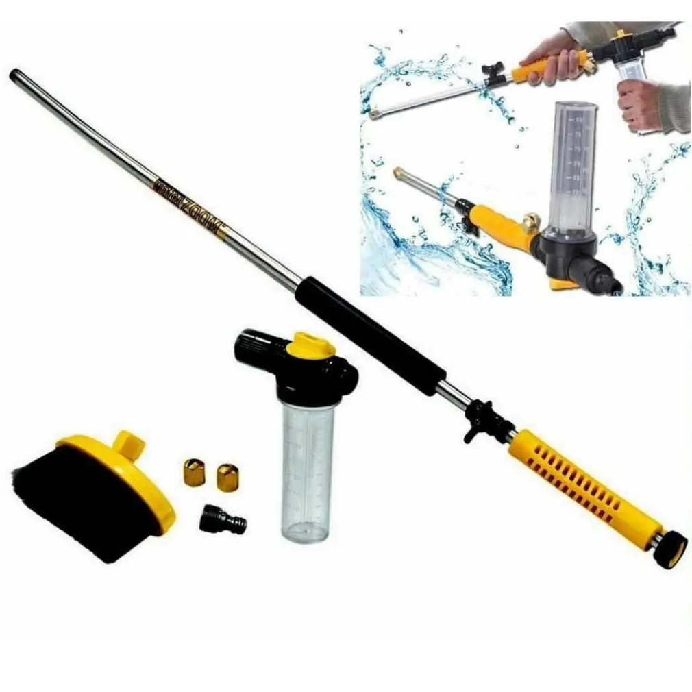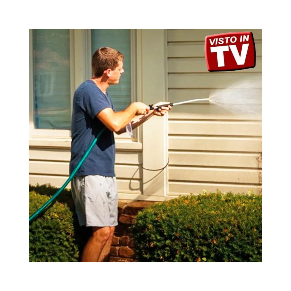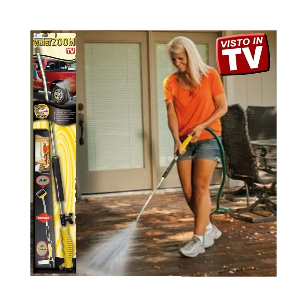 Pulitore ad acqua ad alta pressione Il Water Zoom è un pratico pulitore che consente di utilizzare una normale gomma da giardino per pulire con la sola forza dell’acqua. Questa lancia ad alta pressione consente di pulire comodamente senza l’utilizzo di corrente nè detergenti ogni superficie: dai pavimenti all’auto, dai gradini al rivestimento dei muri di casa. Serve semplicemente collegarlo con gli adattatori presenti nella confezione per iniziare ad usarlo comodamente. Il Water Zoom è realizzato in metallo resistente ed inossidabile, un prodotto unico! Attenzione, nella confezione non sono presenti il serbatoio per il sapone (sostituibile con un comune spruzzino da casa) e la spazzola (molto rischiosa da usare quando sull’auto sono presenti sabbia o fango che possono rigare la carrozzeria)