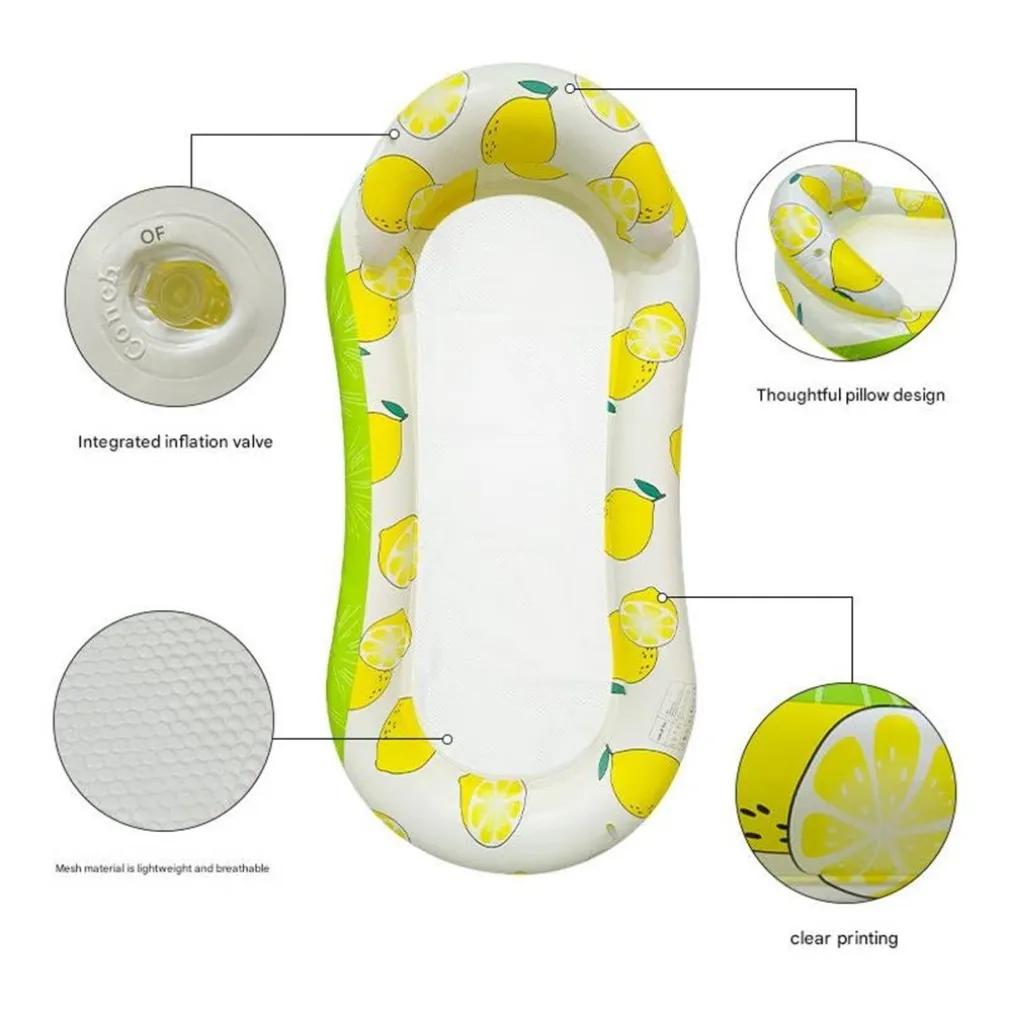 Perfetto per genitori attenti al comfort dei propri figli e ideale per adulti che vogliono rilassarsi con stile, questo lettino gonfiabile per piscina con motivo a limone è molto più di un semplice galleggiante: è un’esperienza di benessere a 360°!
