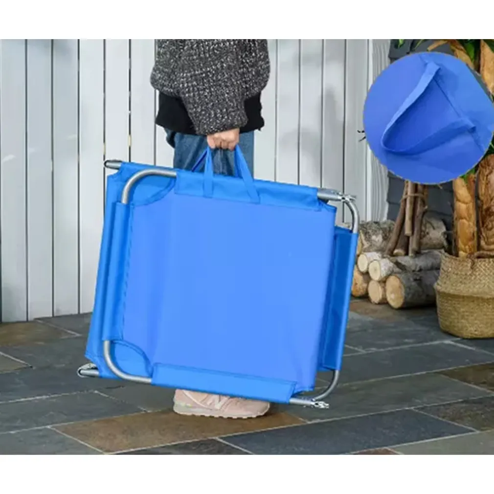 Il lettino in textilene blu è perfetto per ambienti esterni: spiaggia, piscina, giardino, campeggio o terrazzo. È resistente all’umidità e alla luce solare diretta.