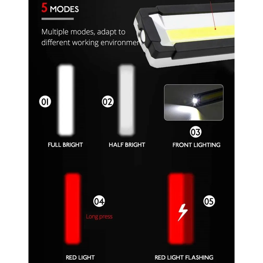 - 5 modalità di illuminazione: LED COB alto, basso LED COB, torcia, rosso COB, rosso lampeggiante COB.