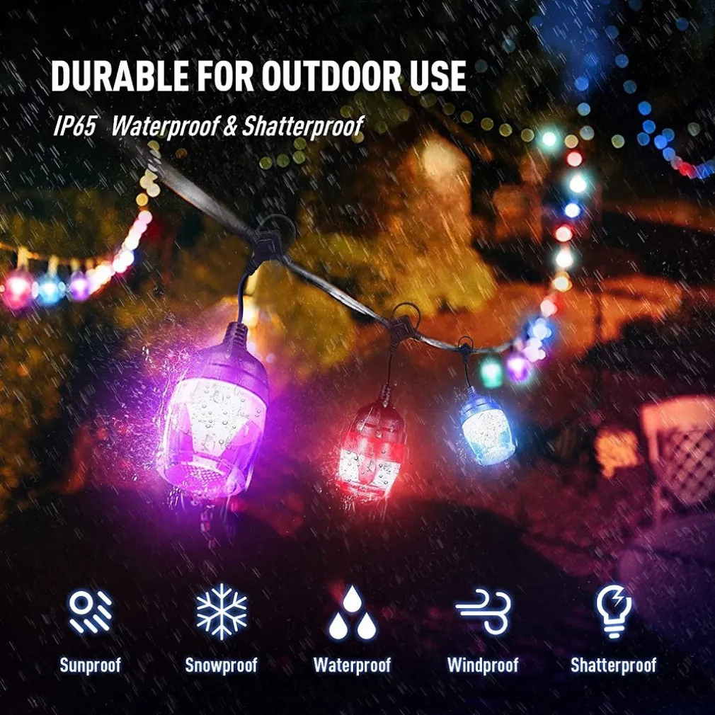 Adatto a vari climi e infrangibile, le luci per esterni di livello commerciale impermeabili adottano lampadine in plastica infrangibile a LED impermeabili IP65, cavi spessi flessibili di grado commerciale e tecnologia avanzata resistente alle intemperie, che può proteggere il filo dalla luce UV, inverno, sole, vento, pioggia battente, neve e qualsiasi condizione meteorologica estrema. Le luci delle corde possono resistere a temperature fredde fino a -20℃ e riscaldare fino a 80℃, durevoli da usare.