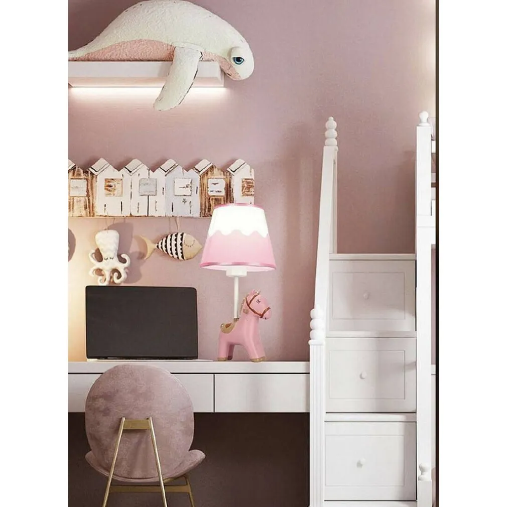 Lumetto moderna da comodino a forma di cavalluccio, ideale per rallegrare la stanza del vostro bimbo. Strutturata in resina, monta un paralume in tessuto decorato con raso.