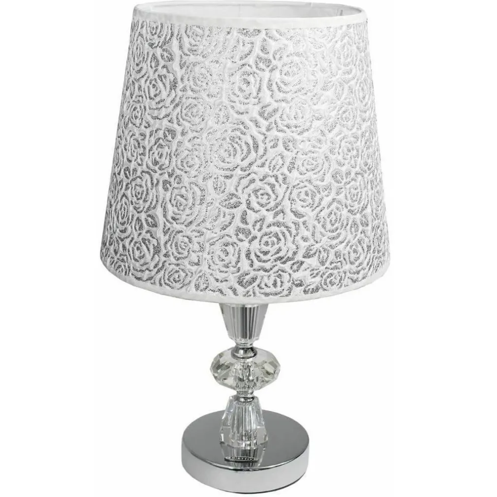 Lume strutturato con una base in acciaio cromato con stelo gioiello e paralume decorato con rose glitter color argento e bianco. Cavo con interruttore on/off e monta al suo interno un portalampada per lampadine E27 Si adatta a qualsiasi tipo di arredamento sia classico che moderno.