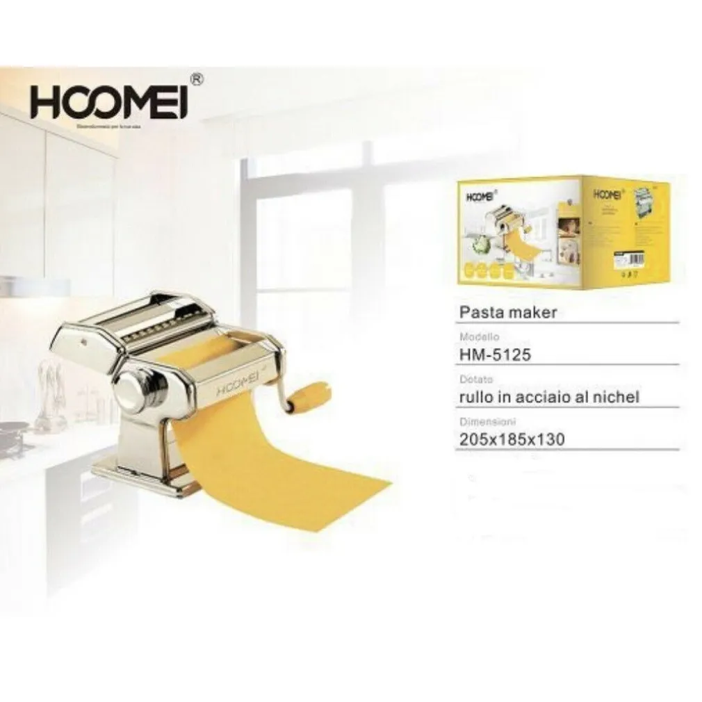 Macchina per la pasta fresca con Rullo Sfoglia Tagliatelle & Lasagna Removibile. Con la macchina per la pasta “Hoomei HM-5125”, potrete fare la pasta fresca in casa in maniera semplice e tradizionale. Ideale per pasta fresca come fettuccine, tagliatelle, lasagne, ravioli e molto altro. La macchina è composta da due rulli in alluminio che possono essere regolati gradualmente ed in maniera accurata fino a 9 posizioni per scegliere lo spessore delle sfoglie più adatto. La macchina Hoomei Pasta Maker è inoltre dotata di un rullo removibile per creare con più faciltà la sfoglia per tagliatelle e lasagna. Una volta che si è raggiunto lo spessore corretto, basta mettere la pasta nell’accessorio taglia sfoglia per lasagne, fettuccine o tagliolini, ed il gioco è fatto. Il set include la macchina, la manopola rimovibile e di agevole impugnatura che rende più facile la lavorazione, il rullo removibile e le istruzioni complete. La macchina è interamente realizzata in acciaio cromato di alta qualità. Ogni componente della macchina per la pasta Hoomei è curato per esaltare l’eleganza e garantire la durata del prodotto negli anni. Facile da utilizzare e da pulire, il corpo è unico con rullo scorrevole e con maniglia rimovibile.