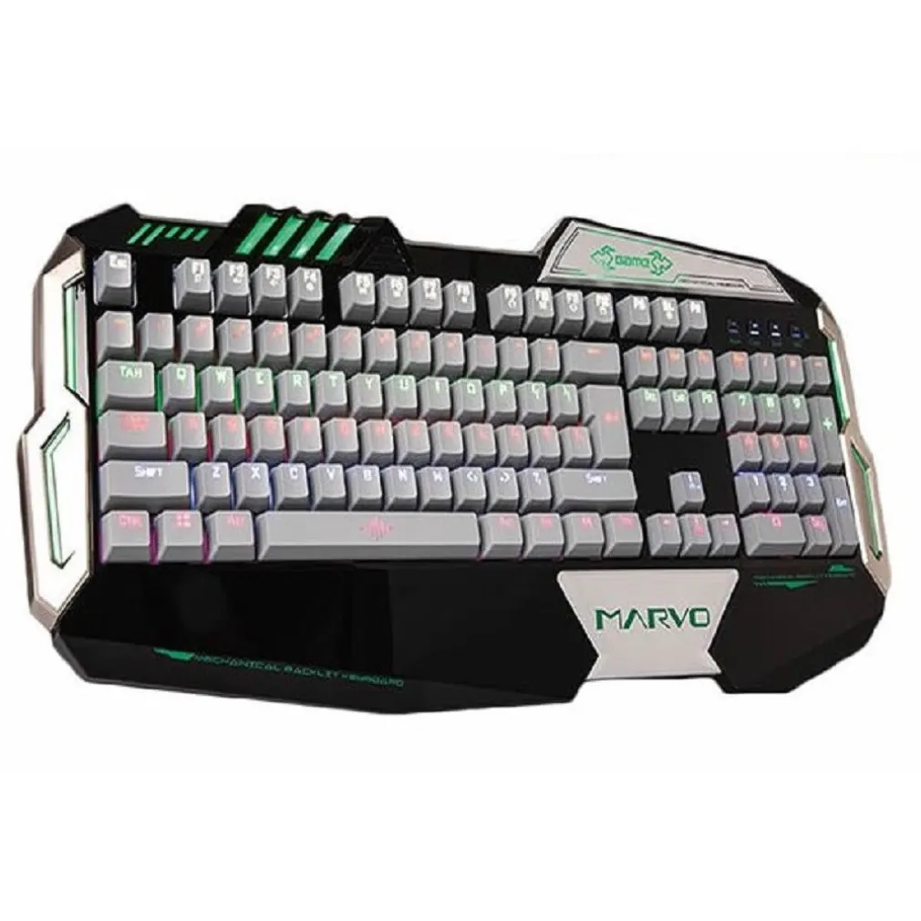 Nuovissima tastiera MARVO – KG910 per gaming, utilizzata da tutti gli appassionati gamers. Tastiera meccanica roll over a piu tasti retroilluminata, ampio bordo poggiapolsi per ridurre la fatica, illuminazione in 6 colori, 8 modalita, 3 livelli di luminosita e velocita, trattamento di composti metallici con filo intrecciato con anello magnetico per eliminare qualsiasi interferenza, design ergonomico e design anti-urto per una durata superiore, USB.