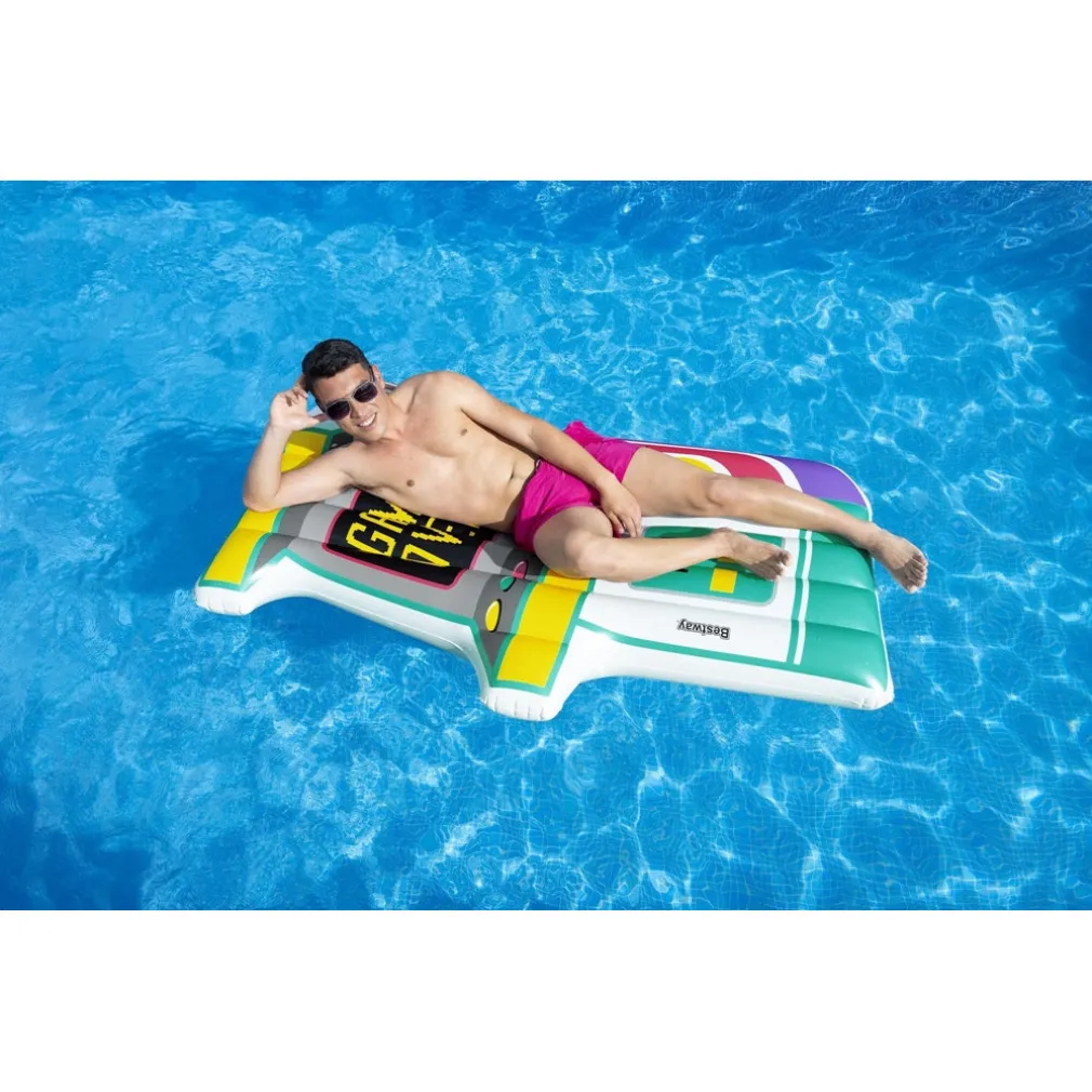 Il materassino Aqua Arcade 43851 si distingue per la sua grafica accattivante e colorata che richiama l’estetica vintage dei più iconici videogiochi da sala. Con la sua forma originale a videogioco arcade, è un richiamo irresistibile per gli amanti del retro-gaming e per chi cerca un accessorio da piscina fuori dal comune.
