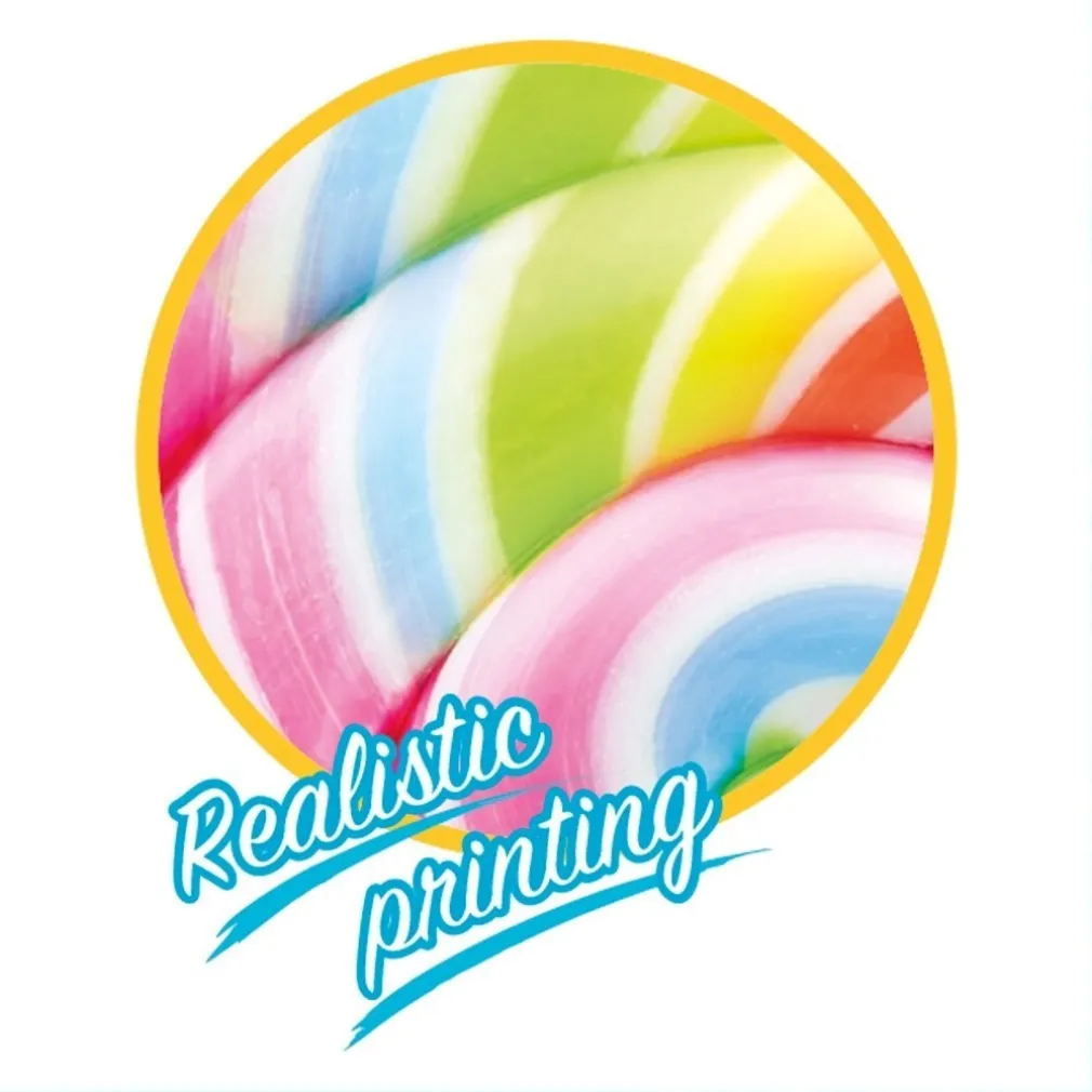 Design divertente e alla moda con una bellissima stampa realistica di un lecca lecca colorato realizzato interamente in PVC di alta qualità. Questo gigantesco lecca lecca gonfiabile misura 208 x 135 cm.