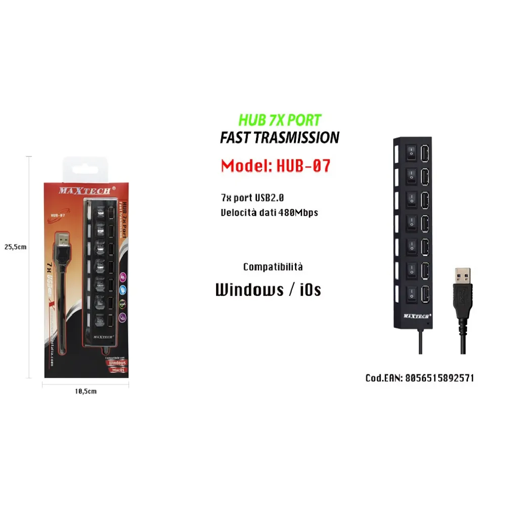 - 1 x MAXTECH HUB-07 USB 2.0 A 7 PORTE AD ALTA VELOCITÀ