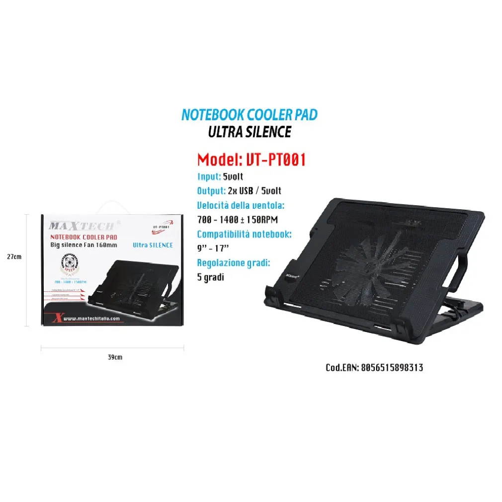 Supporto dotato di ventola alimentate tramite USB, realizzato in plastica resitente, utilissimo per chi utilizza il portatile per lungo tempo, dotato di 2 porte usb. Questo prodotto agevola il raffreddamento del notebook offrendogli maggiore capacità di ventilazione, disperde il calore accumulato dal tuo computer permettendo la circolazione dell’aria. Evita il surriscaldamento del tuo PC portatile grazie alle ventole e rialzo regolabile. Inoltre questo supporto include un sistema di regolazione multiplo angolare ergonomico in accordo alle necessità d’uso del notebook con diverse inclinazioni. L`altezza è regolabile per avere una posizione di lavoro comoda e corretta con benefici immediati al fisico, in particolare a schiena, collo e polsi. Il supporto é inoltre antiscivolo grazie a i suoi 4 cuscini in gomma. Facile da trasportare, può essere utilizzato anche come leggio.