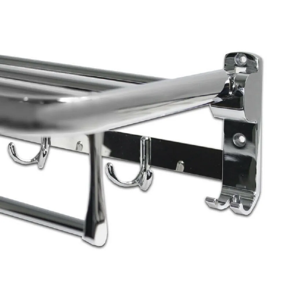 Mensola portasciugamani moderno in acciaio con doppio ripiano per asciugami da bagno e salviette. Può essere richiuso quando non utilizzato. Dotato di 6 ganci perfetti per appendere gli accappatoi. Fissaggio con viti incluse nella confezione.