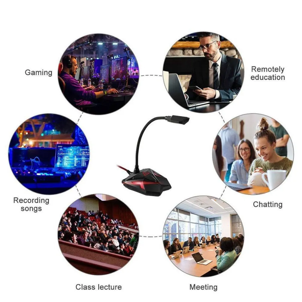 Questo microfono usb da tavola è compatibile con pc a partire da Windows 7/8/10 ecc. Pertanto, è adatto a varie situazioni come home theatre, chat, podcast, Skype, registrazione Yahoo, registrazione YouTube, parlato, messaggistica istantanea, giochi, canto, conferenze, ecc. Pick-up a 360 gradi. Il microfono per computer utilizza la tecnologia di registrazione del suono omnidirezionale