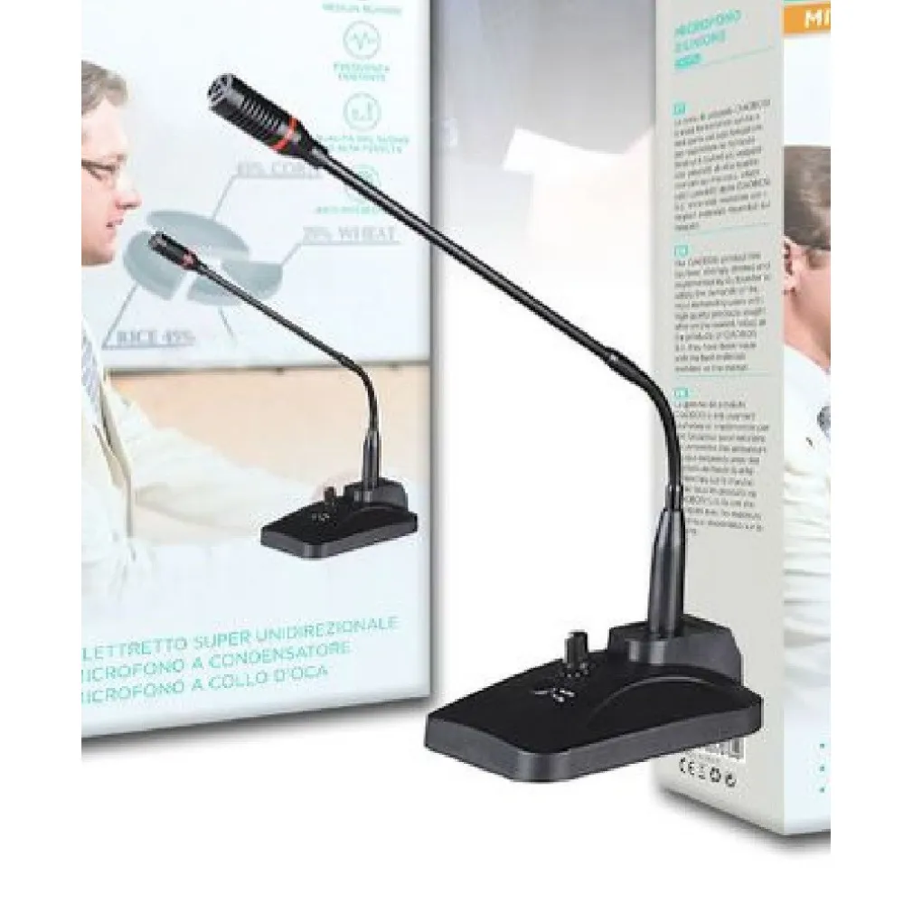 Nuovissimo microfono professionale con cavo e jack in dotazione per poterlo tranquillamente collegare ad un amplificatore o anche ad un mixer. Microfono professionale ideale per meeting conferenze, molto utilizzato in quanto la sua praticità permette di azionare e spegnere il microfono direttamente dalla basetta e regolare la sua angolazione data la sua flessibilità.