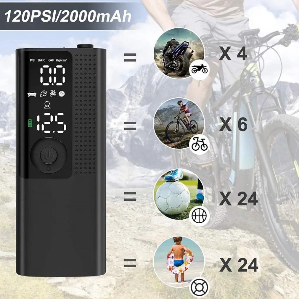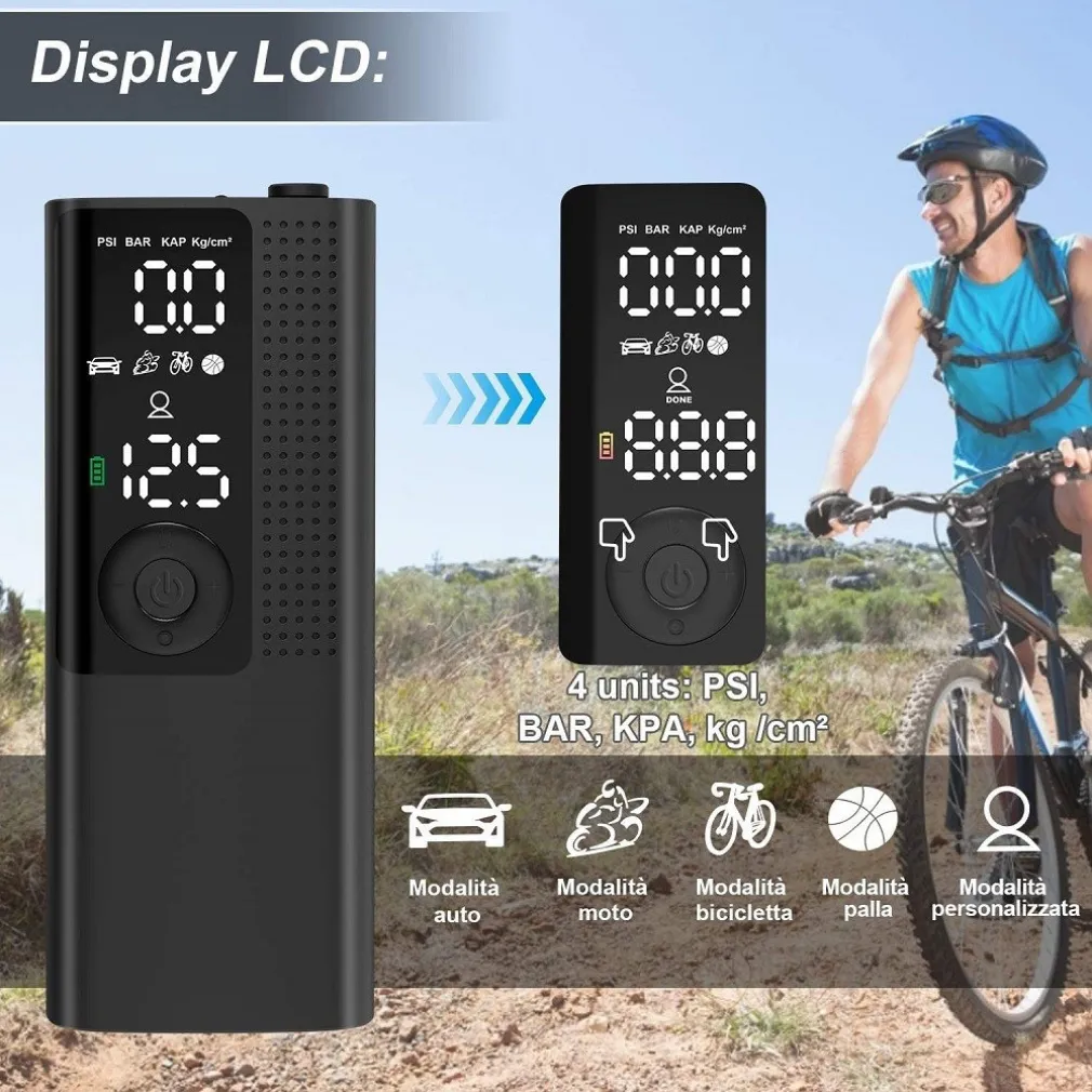 - Compressore portatile di grande capacità. La capacità della batteria è di 2000 mAh 7,4 V, sono disponibili 4 valori di unità: PSI, BAR, KPA, Kg / cm2. Motociclette, biciclette, pallacanestro, automobili e altri prodotti gonfiabili possono essere gonfiato, fino a 120PSI, arresto completamente automatico, dimensioni 15 * 6 * 4 cm, è la più piccola pompa ad aria portatile, in grado di ottenere il miglior tocco di palmare.