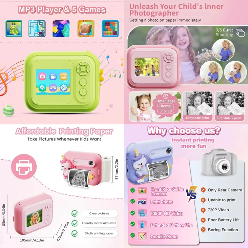 Scopri la Mini macchina fotografica portatile con design unicorno, il regalo perfetto per ogni bambino che ama immortalare i suoi momenti più belli. Con un design colorato, resistente e pensato per bambini dai 3 ai 14 anni, questa fotocamera non è solo divertente ma anche altamente funzionale. Perfetta per stimolare la creatività dei più piccoli, permette di scattare foto e registrare video in HD, stampando istantaneamente le immagini grazie alla tecnologia di stampa termica “zero inchiostro”. Non perdere l’occasione di sorprendere il tuo bambino: visualizza subito il prodotto e fai felice il piccolo fotografo di casa!