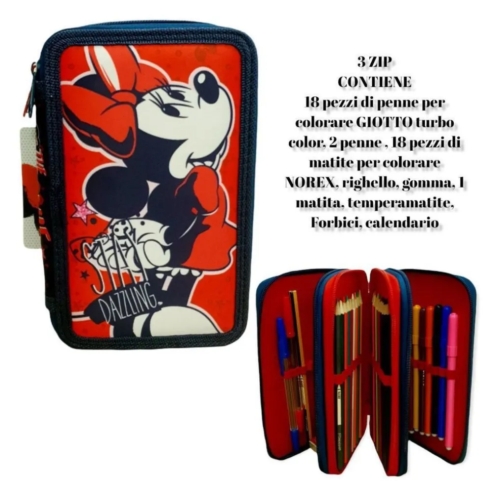 L’astuccio si compone di 3 scomparti, rifinito ognuno con una chiusura a zip, il cui contenuto è così ripartito: nel primo reparto troverete 1 matita, 1 penna Rossa, 1 penna Blu, 1 gomma, 1 temperamatite, 1 righello, 1 squadretta e 1 tabella con lo schema delle ore e dei giorni della settimana in cui poter appuntare l’orario scolastico; nel secondo 18 matite colorate; nel terzo infine 18 pennarelli colorati Giotto Turbo Color. Dimensioni: 20 x 13 x 6 Cm.