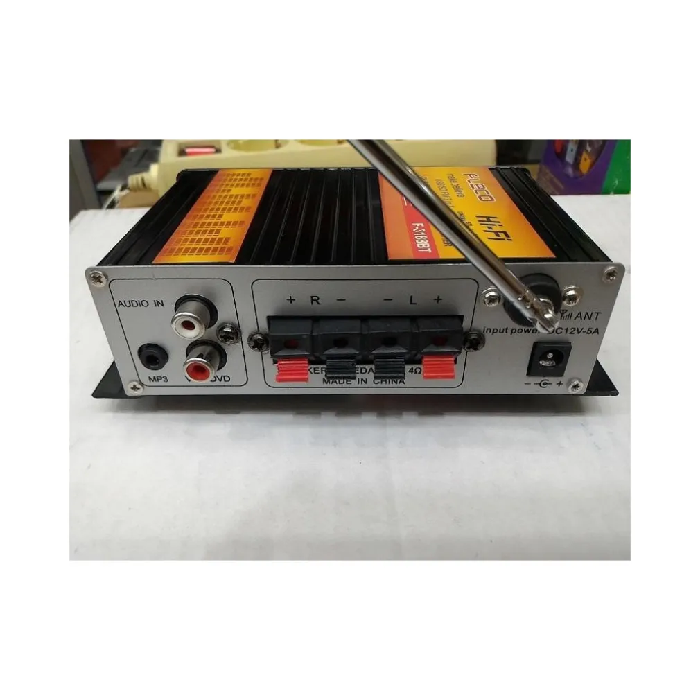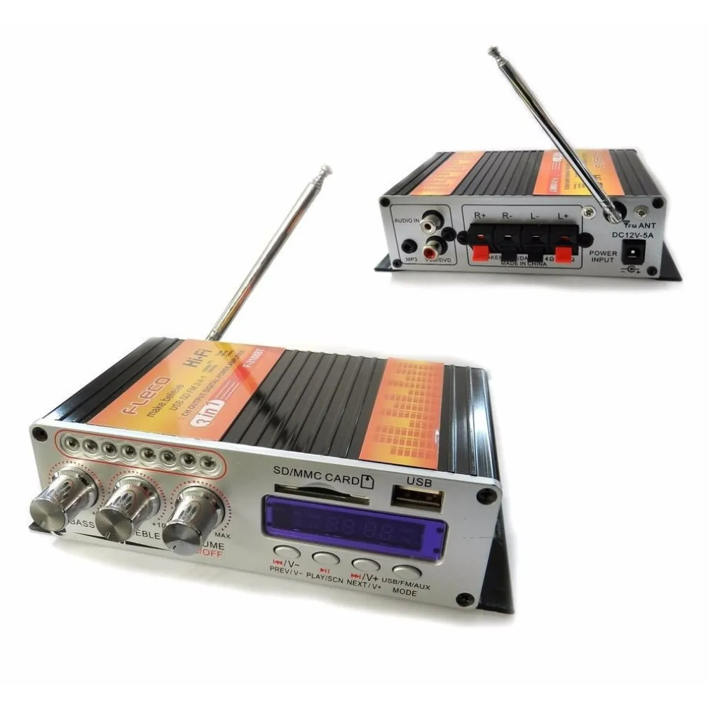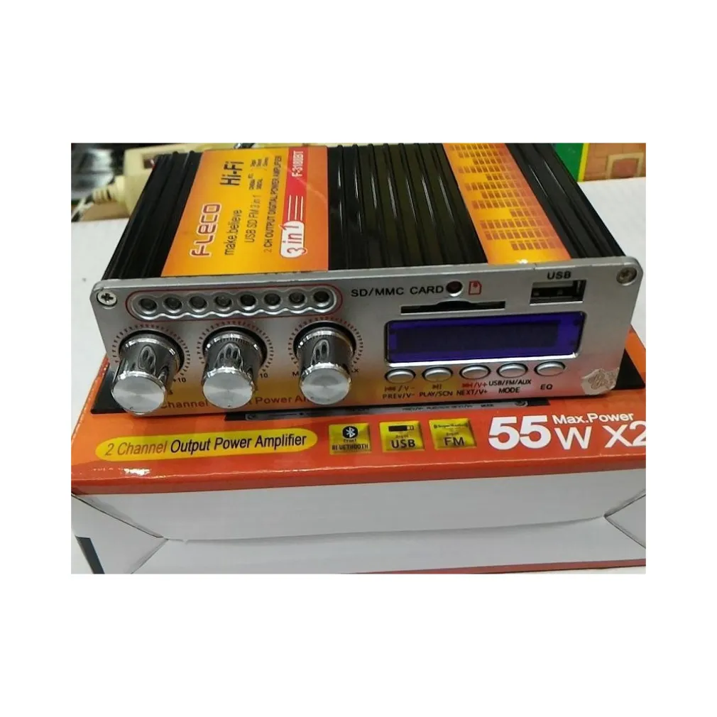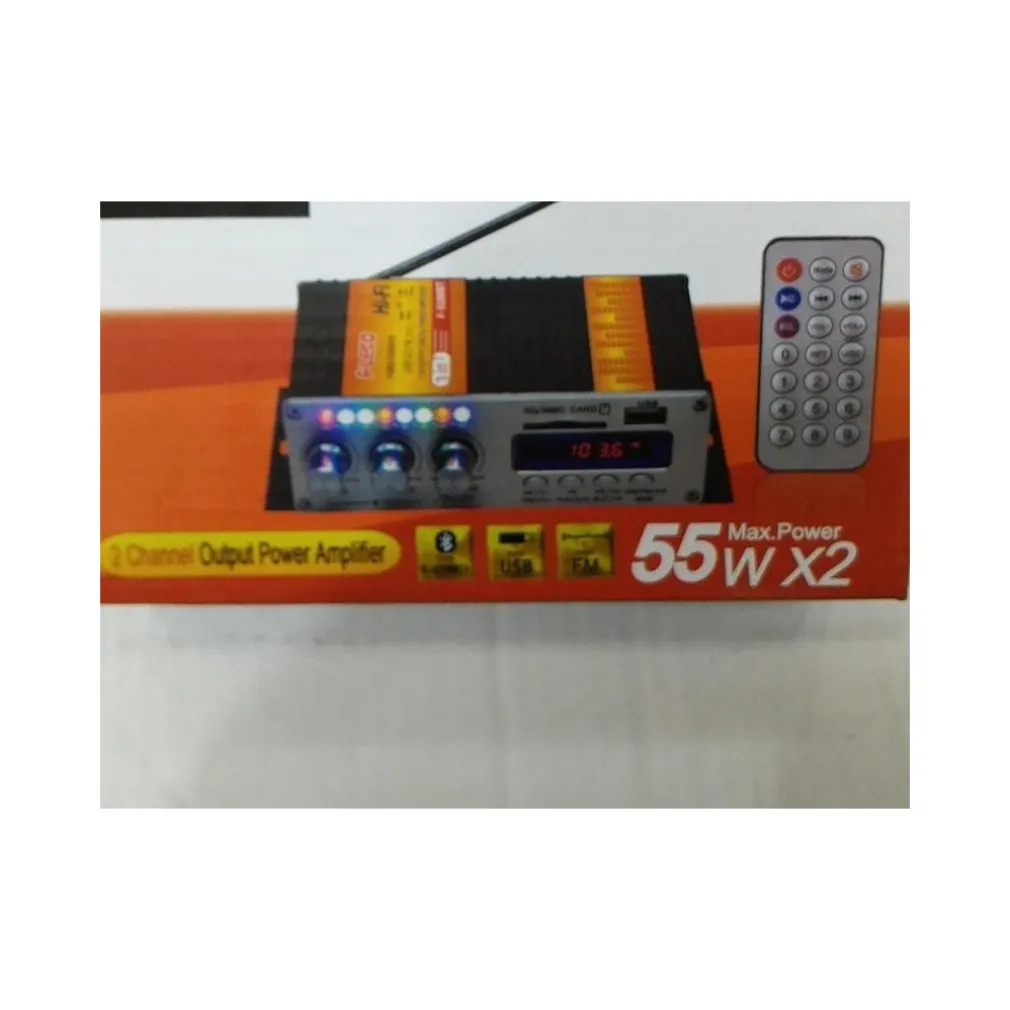 Amplificatore audio con funzione Bluetooth ed Aux, piccolo e compatto da installare ovunque utile per migliorare e amplificare la qualità del suono in auto o a casa. Alimentazione a 12V (alimentatore non incluso), sviluppa una potenza di 55W su 2 canali, quindi 2x27W. Dispone di una porta usb per la riproduzione di mp3 ed utile anche per la ricarica dei dispositivi, ingresso SD se non disponete della penna USB, completo di telecomando per la gestione a distanza, munito di antenna per ricevere segnali FM. Possibilità di equalizzare il suono a nostro piacimento grazie ai tre potenziometri dove sarà possibile controllare gli alti ed i bassi ed il volume.