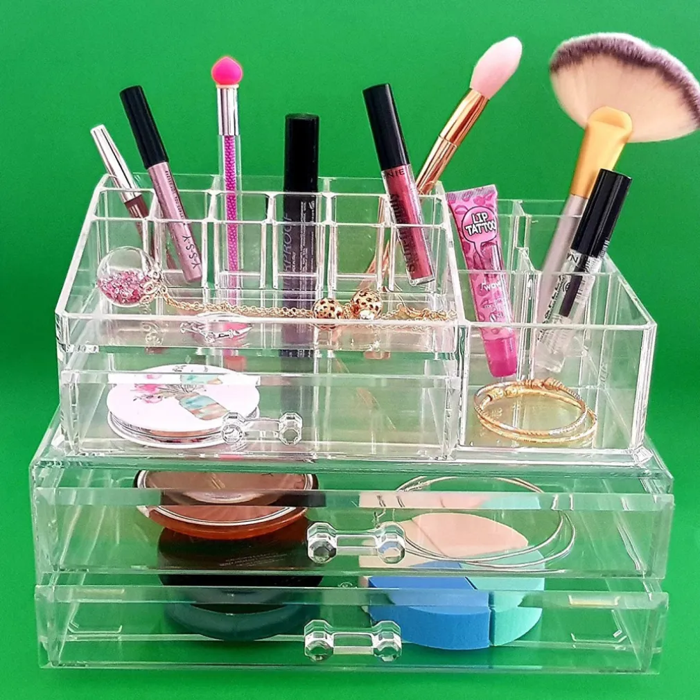 - Design Funzionale: L’organizzatore è dotato di 15 comparti, tra cui 3 cassetti, offrendo uno spazio dedicato per tutti i tuoi cosmetici, gioielli e accessori.