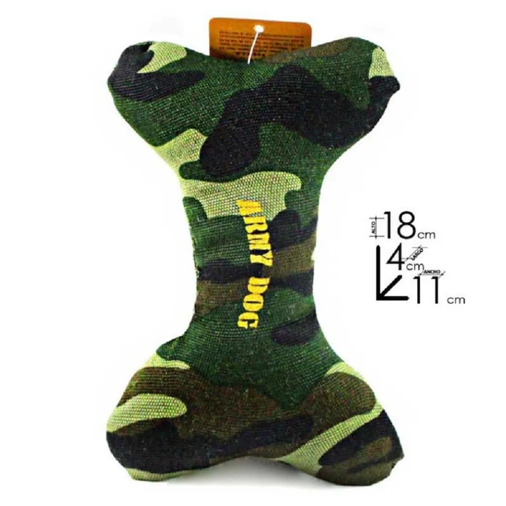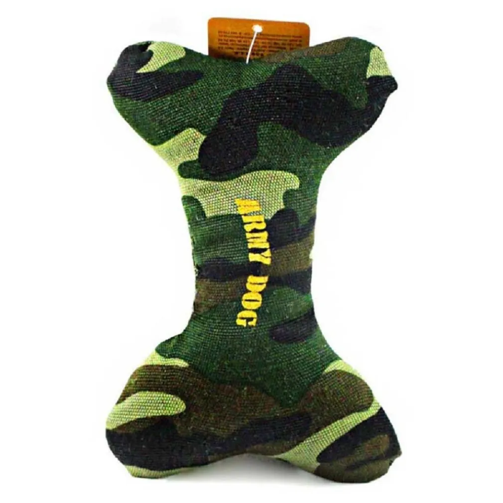 Fai divertire il tuo cane con il giocattolo a forma di osso in tela. Tenero giocattolo per cani dalla forma di un osso colore verde militare. Realizzato in tela di lunghezza 18 cm circa.