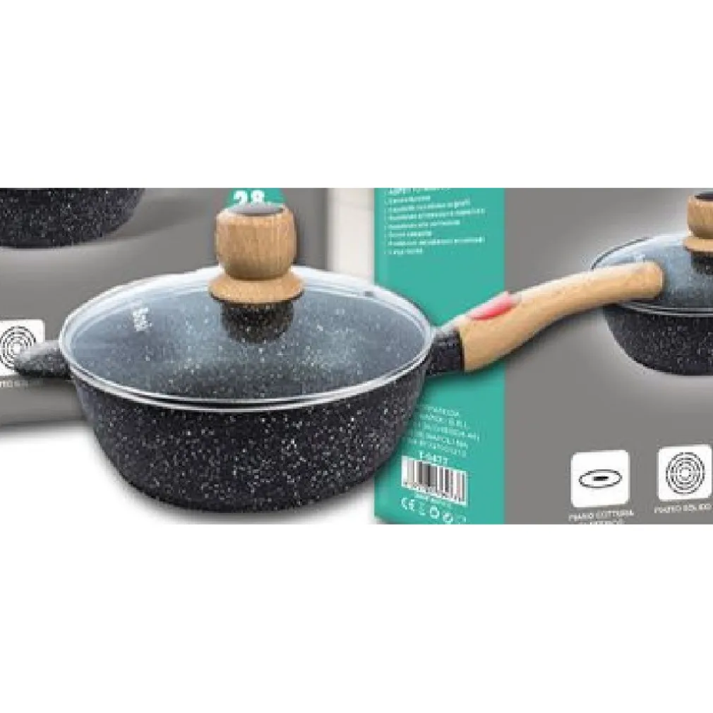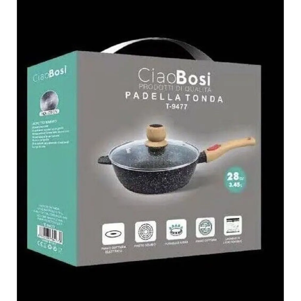 Padella tonda T-9477 da 28 cm 3,45Lt con coperchio in vetro e manici in legno, pfoa free (libera da qualunque sostanza chimica tossica e dannosa per la salute), fondo ad altissima conducibilita’ di calore ideale per tutti gli usi in cucina: cuocere, arrostire, grigliare, friggere, rosolare.
