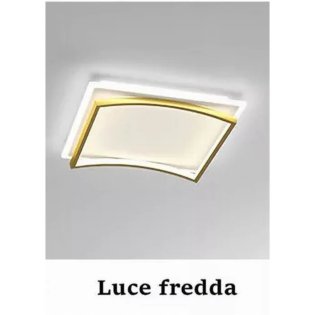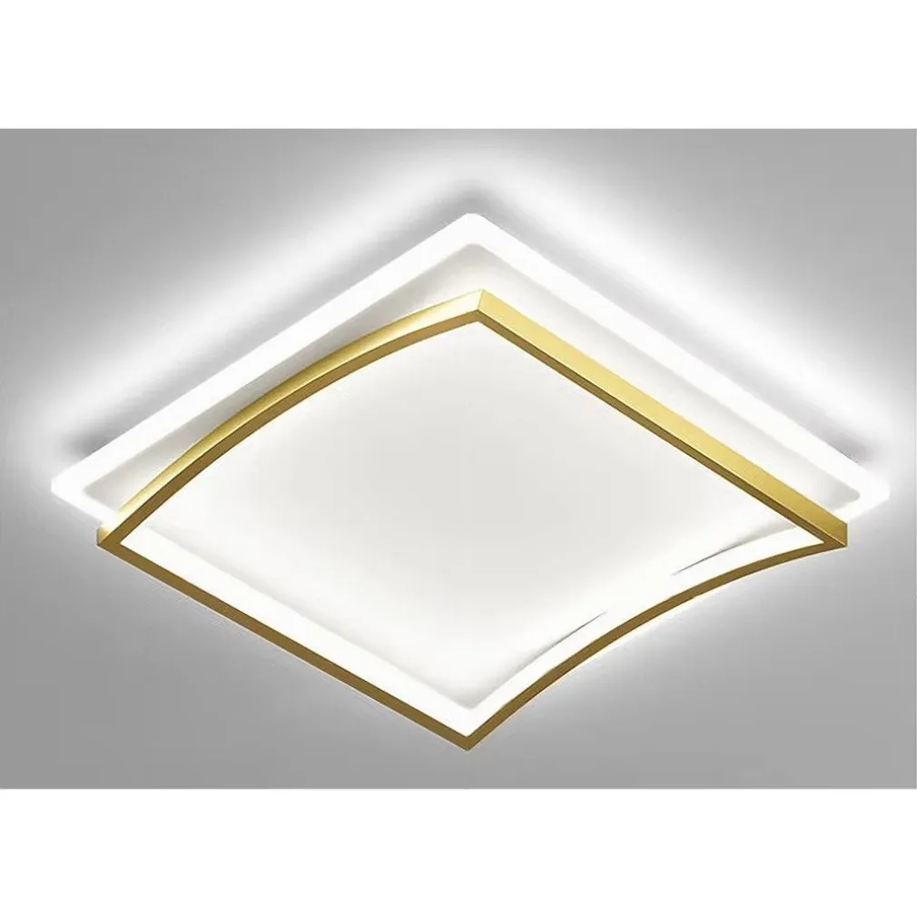 Il design minimalista e raffinato, con due quadrati sovrapposti oro e bianco, crea un effetto tridimensionale che aggiunge profondità e carattere agli ambienti interni. Realizzata in alluminio e PVC di alta qualità, questa plafoniera è la soluzione ideale per arricchire camere da letto, soggiorni, cucine, uffici, bar e ristoranti.