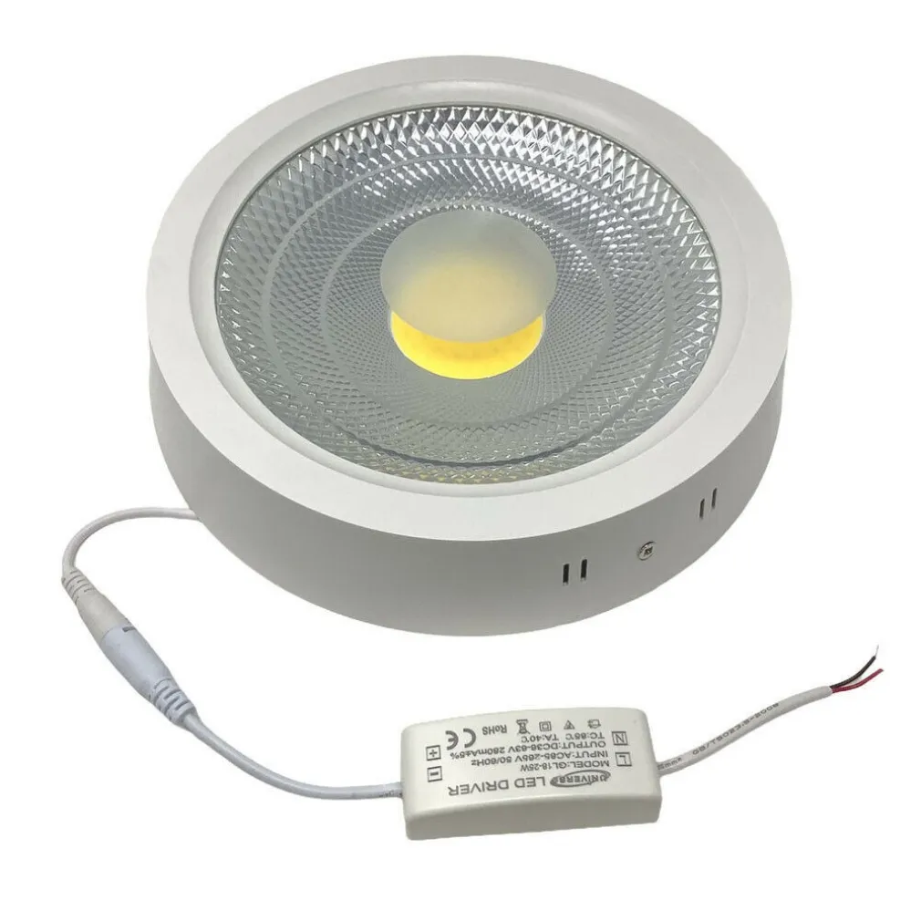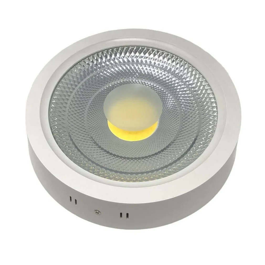 Plafoniera led cob ad altissima luminosità 25 watt, strutturata in ABS di colore bianco con montaggio esterno al soffitto è indicata per l’illuminazione di case, uffici ma anche supermercati, bar e ampi locali commerciali. Fornita con driver per un collegamento diretto a 220v, composta da un unico led centrale con riflettori interni che permettono un ampio fascio di luce di circa 90°.