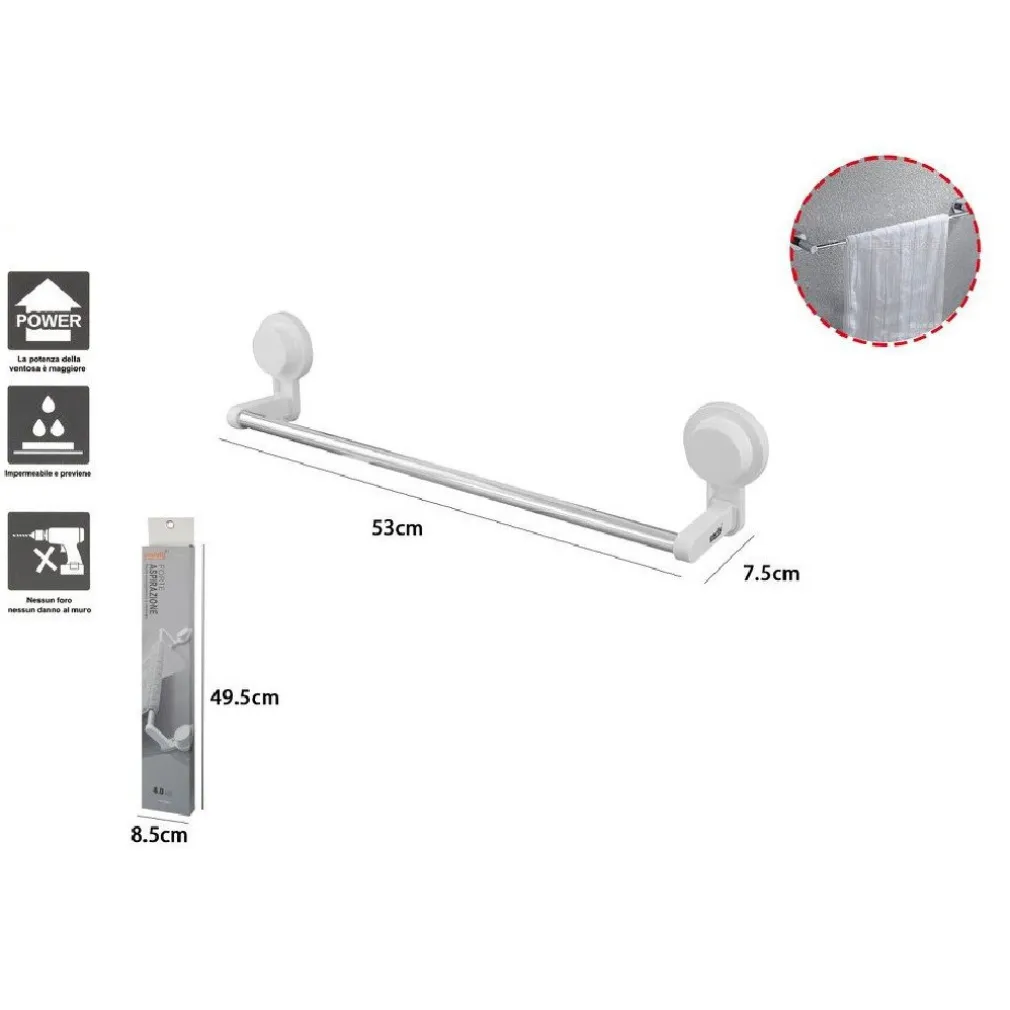 Porta asciugamani con ventose a parete con asta in acciaio da 53 cm. Ideale da installare su piastrelle in ceramica, acciaio inox, specchi e vetri, componenti metallici e altre superfici metalliche lisce. Grazie alla sua ventosa ad aspirazione il fissaggio sarà facile e la presa resistente. Non necessita di alcun foro per il fissaggio quindi è possibile effettuare il riposizionamento.