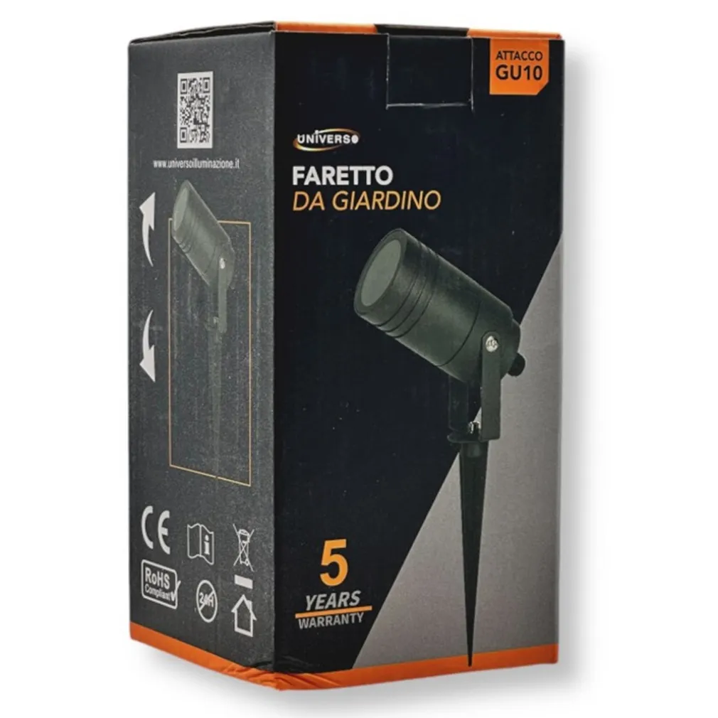 Il kit include il portafaretto in alluminio, il picchetto da interramento, una chiave a brugola per il montaggio e la base circolare di supporto. La lampadina GU10 non è compresa nella confezione.