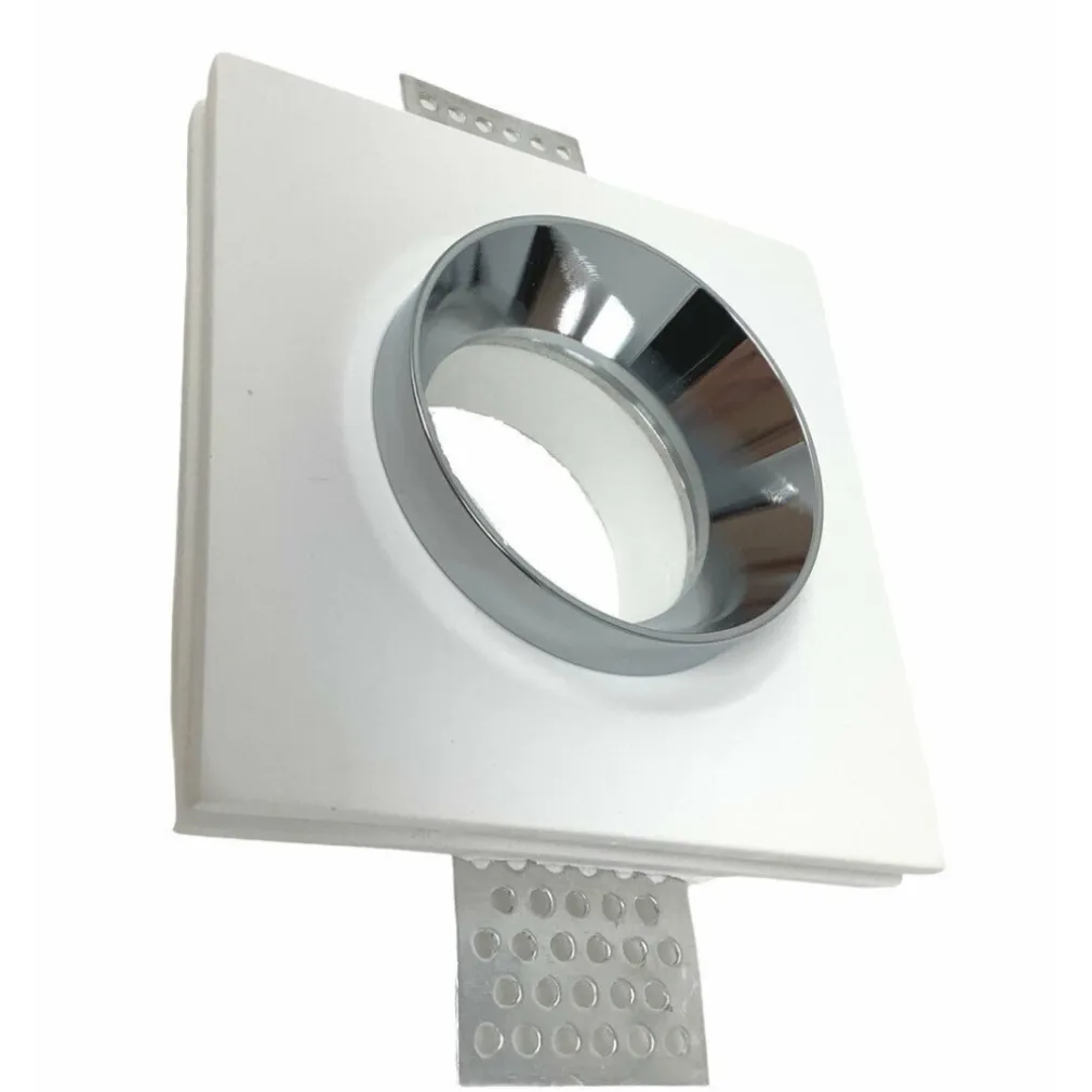 Bellissimo incasso per faretto in gesso verniciabile a scomparsa. Ideale per installazione in soffitti o pareti di cartongesso, grazie alla base grezza potrete scegliere se lasciarli bianchi rendendo il tutto un tutt’uno con il soffitto o verniciali del colore desiderato. La scelta di questi modelli fa si che la luce emessa dal faretto scelto crea dei giochi di luce internamente all’incasso, la luce riflette o sul colore o sul bianco dell’incasso stesso. Il fissaggio è semplice e veloce mediante alette in metallo forato che aderiscono perfettamente al cartongesso.