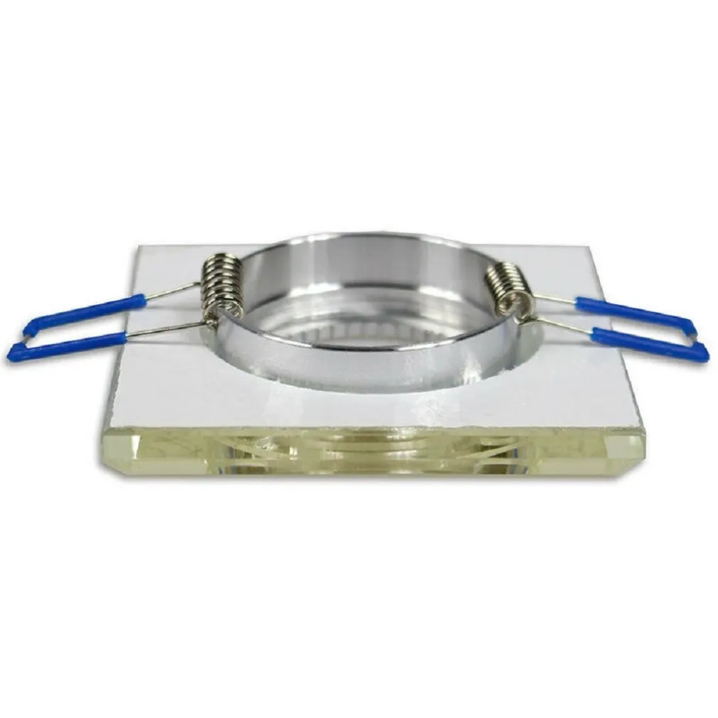 Incasso per faretto quadrato in vetro glitterato, decorato con venature bianco in oro o argento. Adatto per qualsiasi faretto con diametro da 5 cm. Con fissaggio a molle è ideale per controsoffittature, si abbina facilmente ad un arredamento lineare e moderno.