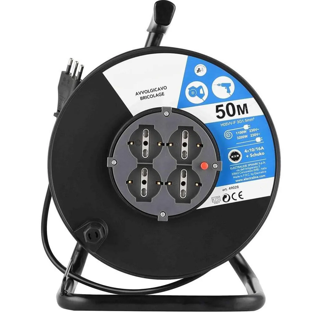 Avvolgicavo con 50mt. di cavo H05VV-F 3G1,5mm. – 4 prese 16A 230V, sistema sicurezza per bambini con disgiuntore termico. Prolunga elettrica con avvolgicavo 4 prese polivalenti (schuko 10/16A) spina grande 16A. Cavo HO5 VV-F sezione 3G1,5 mm² lunghezza 50 metri. Protettore di sicurezza – scollega la corrente quando la potenza supera il limite di portata. Tutte le prese sono dotate di children safety – impedisce di introdurre corpi estranei nella presa in tensione. Potenza massima quando il cavo è avvolto: 1100W; Potenza massima quando il cavo è svolto: 3200W.