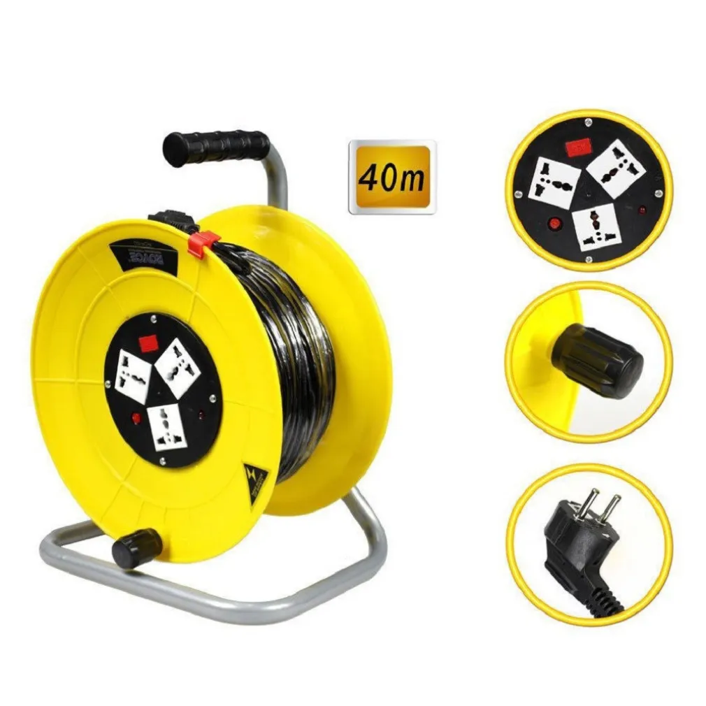 Prolunga avvolgicavo da 40 mt con 3 prese sia schuko che attacco universale con spina 16A. Dispone di una manopola che consente di riavvolgere il cavo quando non più in uso, di un manico antiscivolo per un trasporto sicuro e pratico e di una solida base.